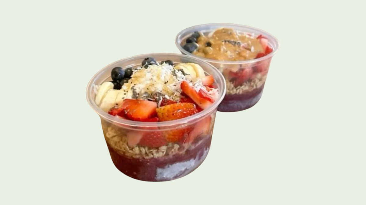 Гранола: йогурт обезжиренный, овсянка, орехи, фрукты, ягоды.
