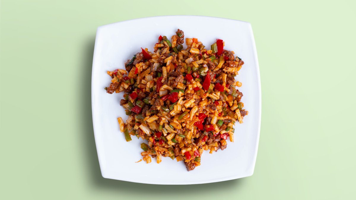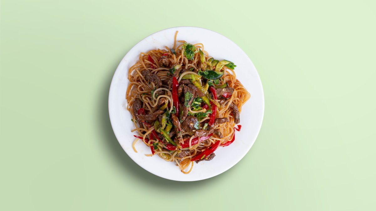 Жаренный лагман с говядиной и овощами мелкой нарезки.