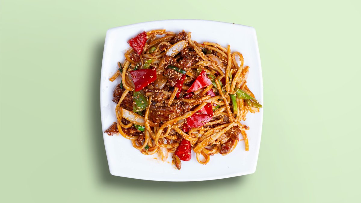 Острый жаренный лагман с говядиной и дунганским перцем.