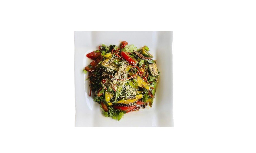 Мясо, огурец, зеленый лук, чеснок, помидор, зелень, соевый соус