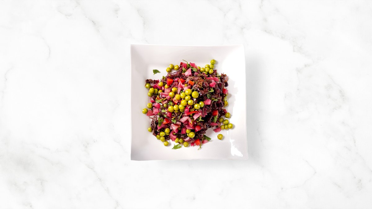 Картофель, свекла, морковь, соленые огурцы, зеленый горошек и растительное масло