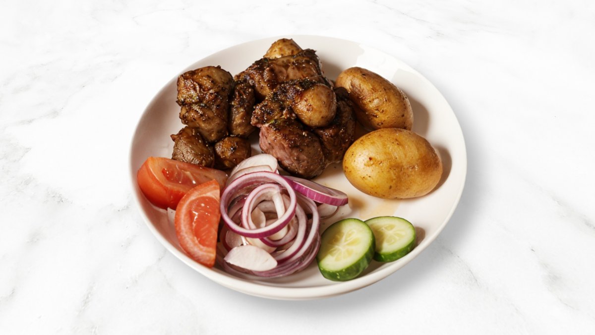 Говяжье мясо с томатной пастой и луком, лук, томат, картошка по деревенский, чеснок, свежие помидоры