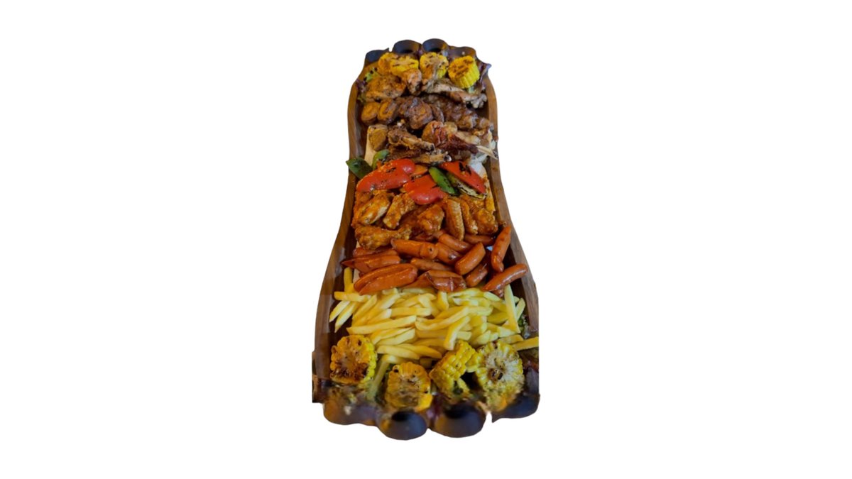 Бедра 300 Гр, куриные крылышки 300 гр. шашлык молотый 2 шт, говяжьи рулет 2 шт, охотничий сосиски 2 шт, баранина корейка 3 шт, овощи гриль, картошка фри 200 гр, кукуруза 200 гр