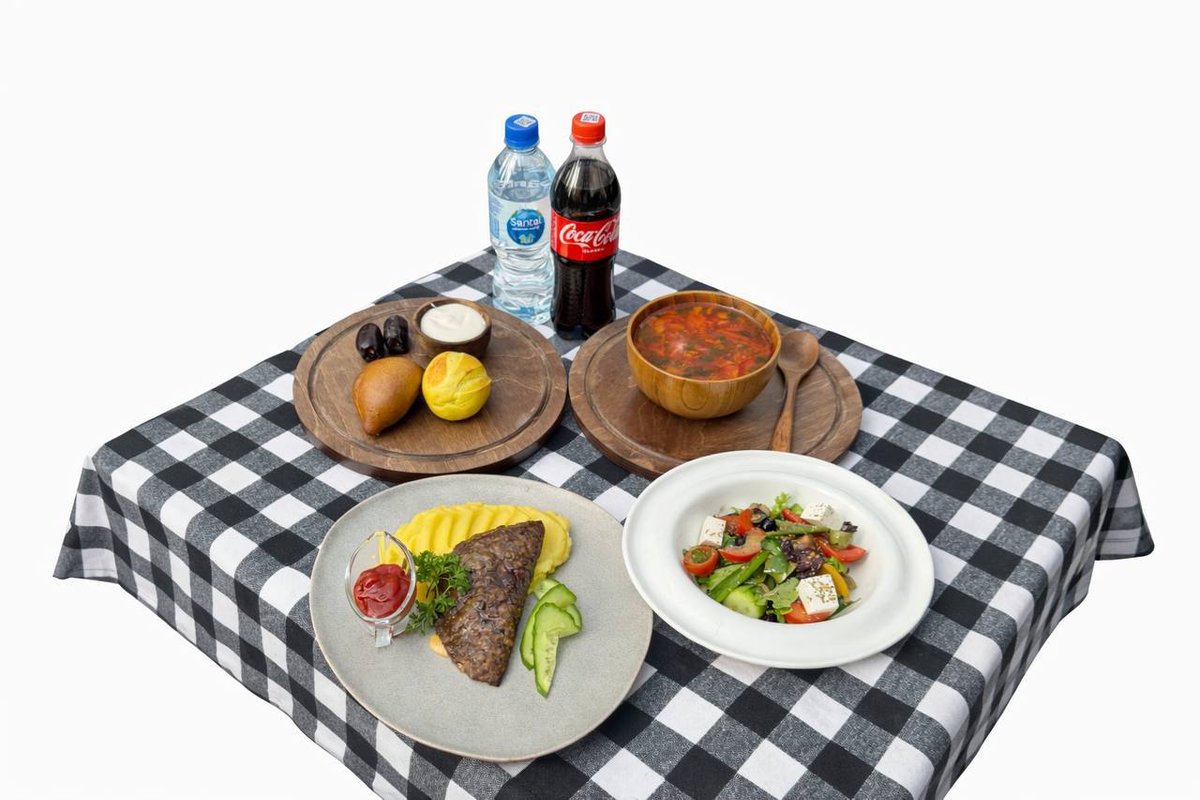Котлеты с сыром и пюре Греческий салат Украинский борщ Два вида свежего хлеба Домашний каймак Финики Coca-Cola 0,5 л Вода 0,5 л