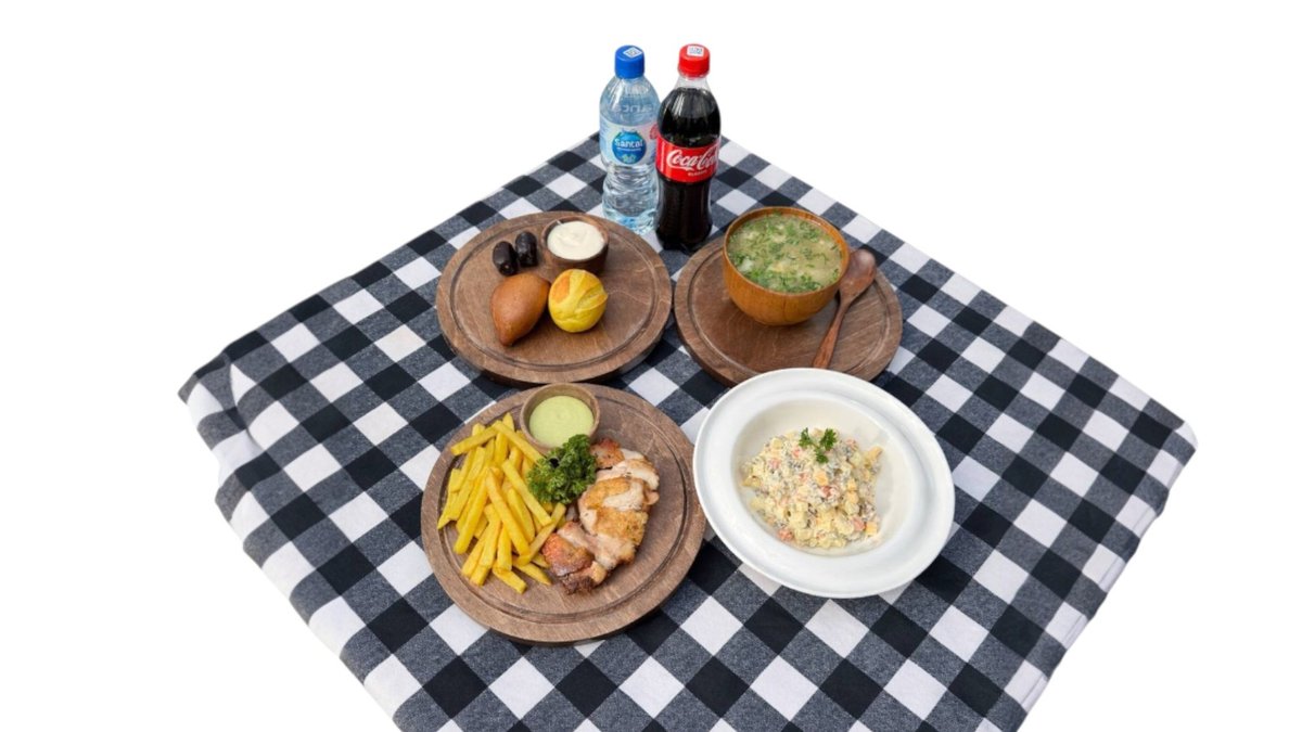 Запечённая курица с хрустящим картофелем фри Наваристый суп с пельменями Классический салат «Оливье» Два вида свежего хлеба Домашний каймак Финики Coca-Cola 0,5 л Вода 0,5 л