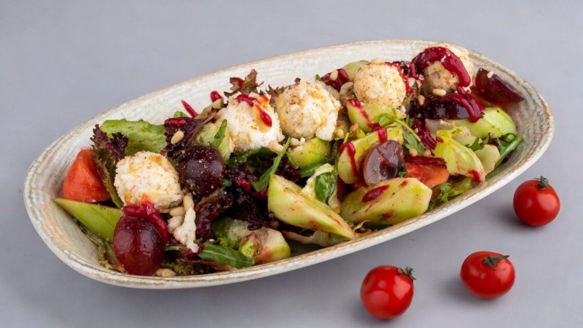 300г Омлет, лук, стручковая фасоль, вяленые помидоры, сыр, красная рыба, микс салат