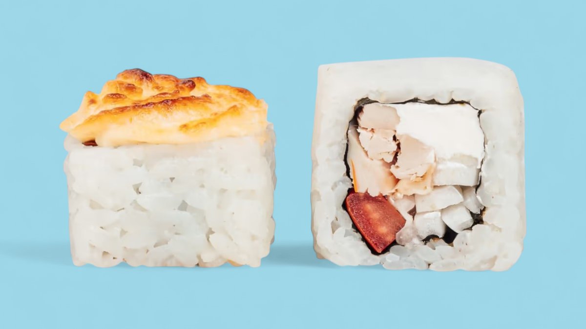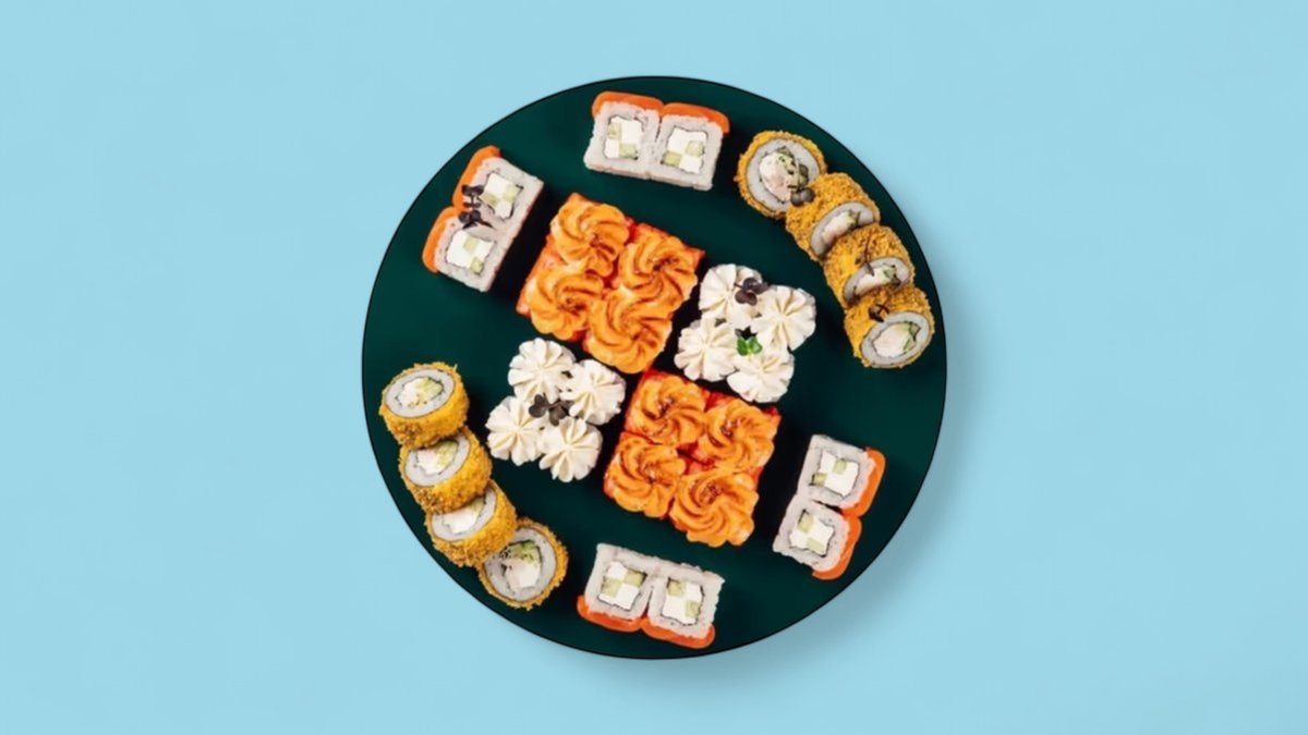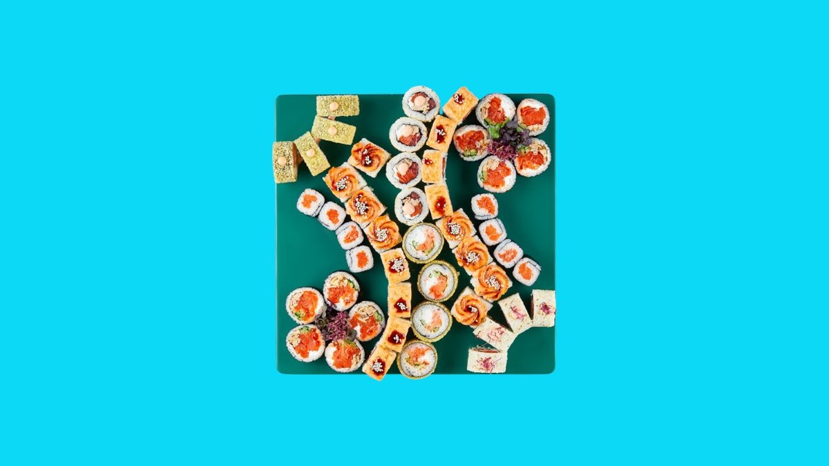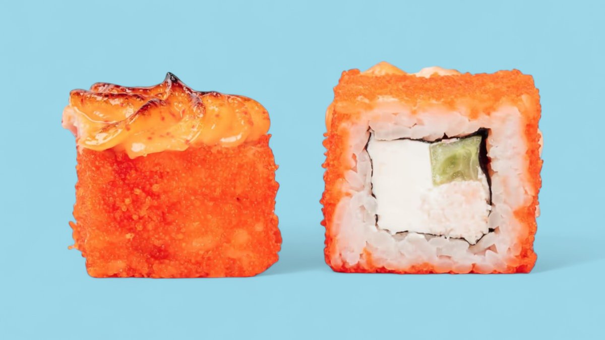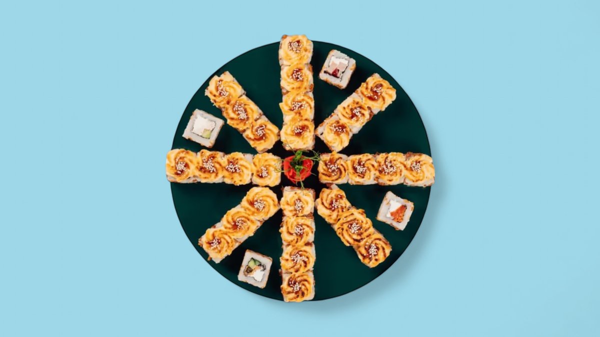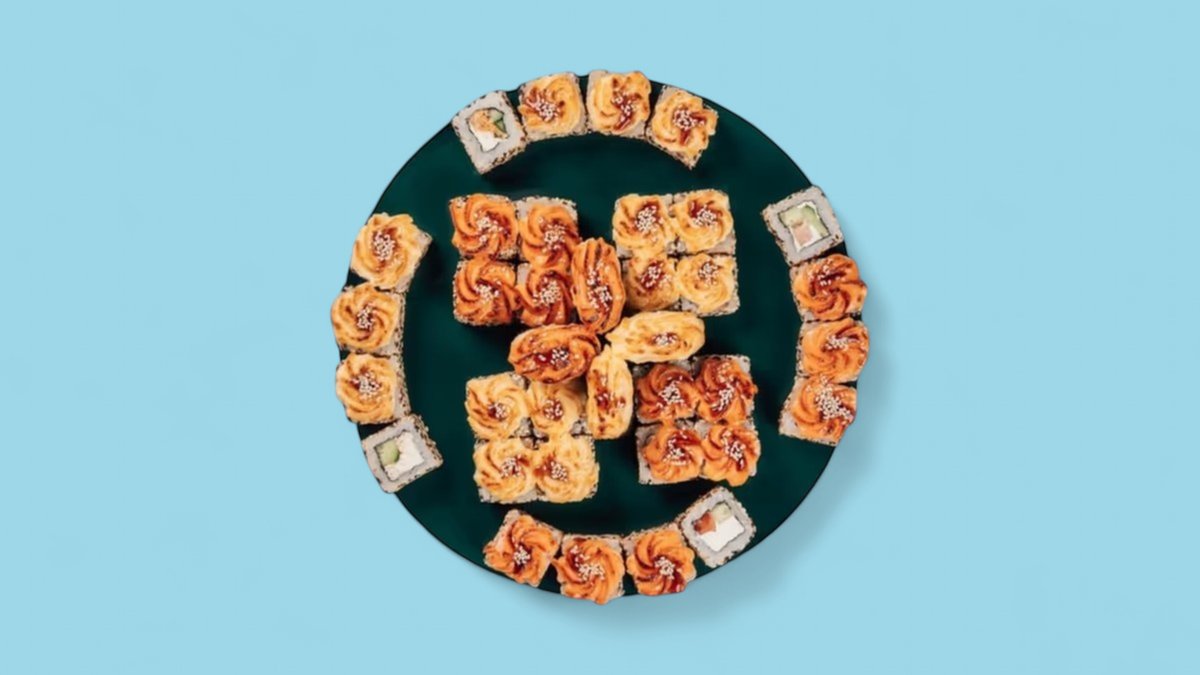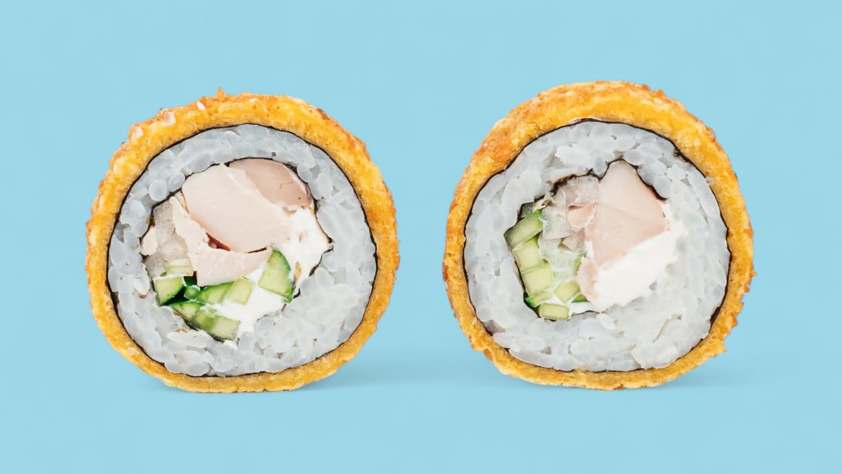 1320г Роллы "Филадельфия", 8 шт. Мини-Роллы сливочные с огурцом, 8 шт. Горячие Роллы с Курицей, 8 шт. Запеченные Роллы "Калифорния", 8 шт.