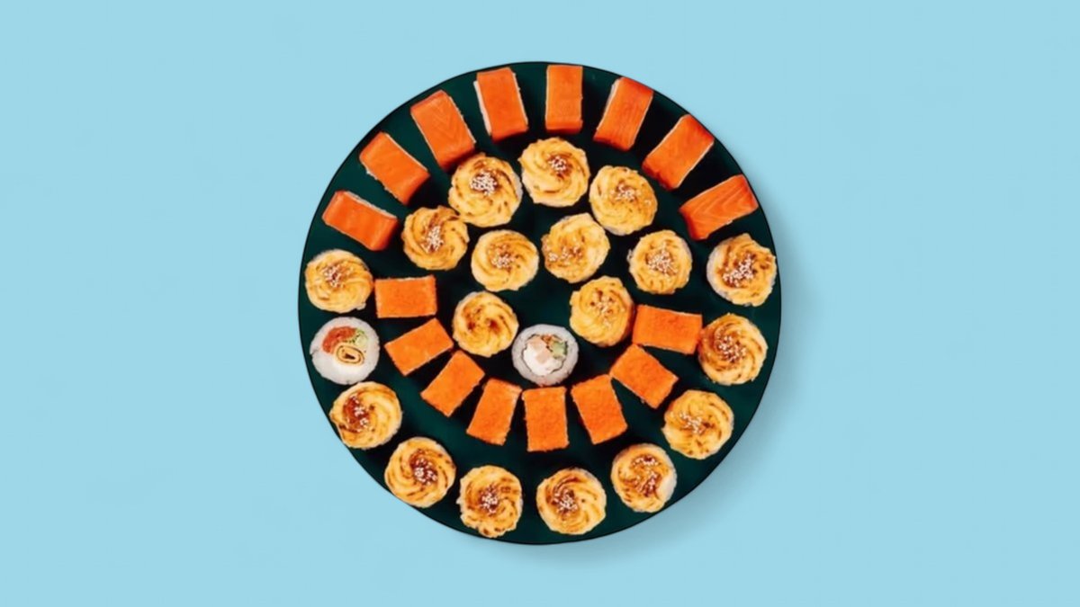1365г Мега-Роллы с Курицей, 10 шт. Роллы "Калифорния", 8 шт. Роллы "Филадельфия" "Де Люкс", 8 шт. Мега-Роллы с Форелью, 10 шт .