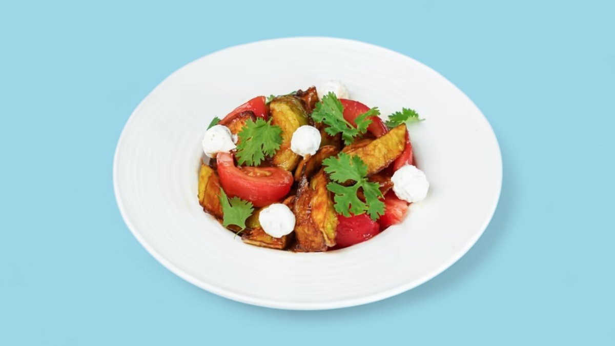 170г Жареный баклажан, помидор, сливочный сыр, соус "Кимчи", сладким соус "Чили", кинза, базиликовое масло и сушёные маслины.