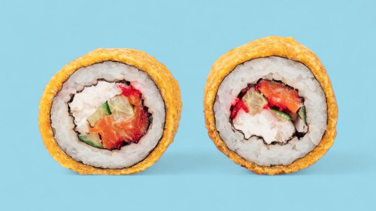 236г Форель, творожный сыр, огурец, капуста, икра "Масаго", соус "Спайси", панировочные сухари и кляр.