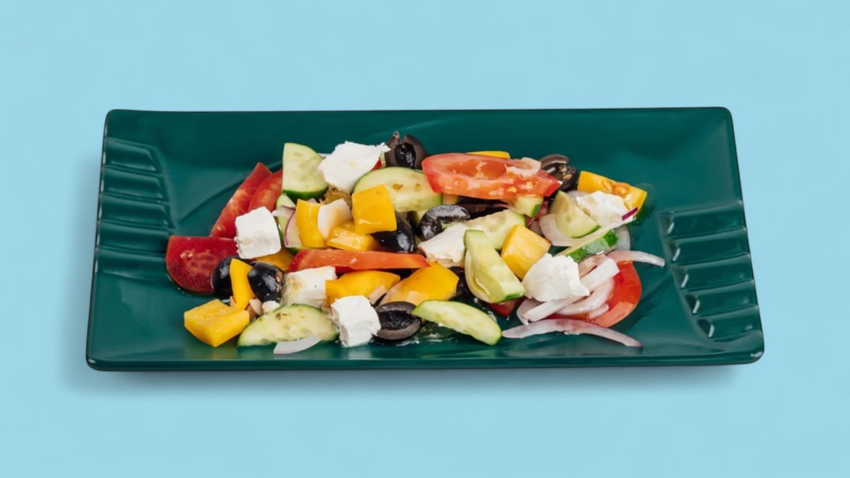 165г Помидор, сладкий перец, огурцы, Сыр "Фета", лук "Шалот", маслины, заправка из оливкового масла.