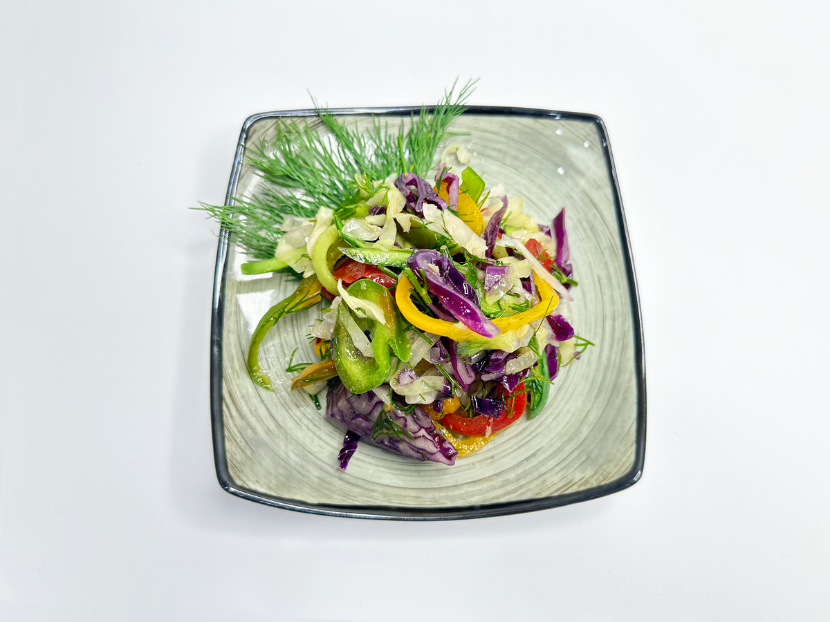 Сочный салат с овощами. Капуста, картофель и морковь гармонично сочетаются со свёклой, придавая блюду насыщенность. Зелёный горошек и огурец добавляют свежесть, а зелёный лук и масло подчёркивают вкус