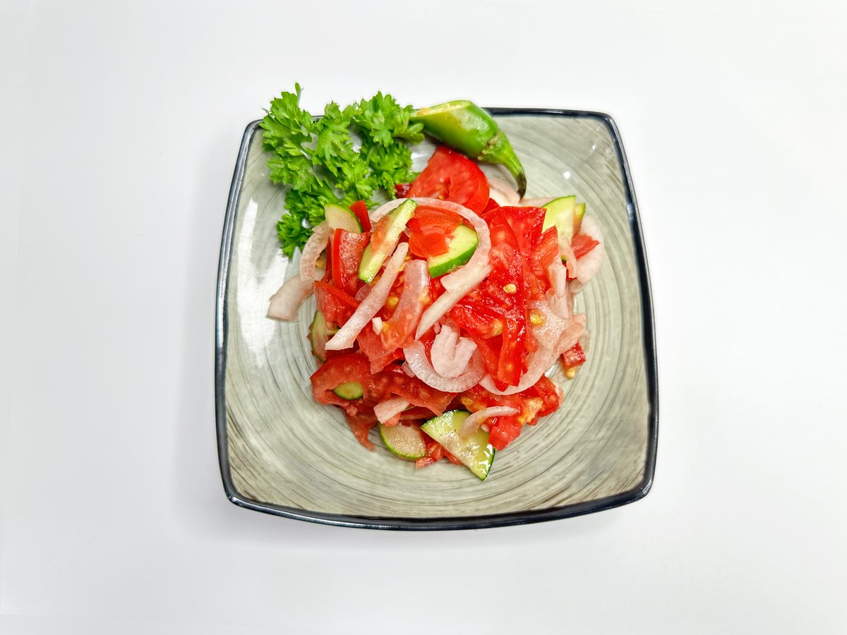Свежий салат с помидорами и огурцами. Лук добавляет пикантность и лёгкую остроту, делая вкус ярким и насыщенным (2 порции)
