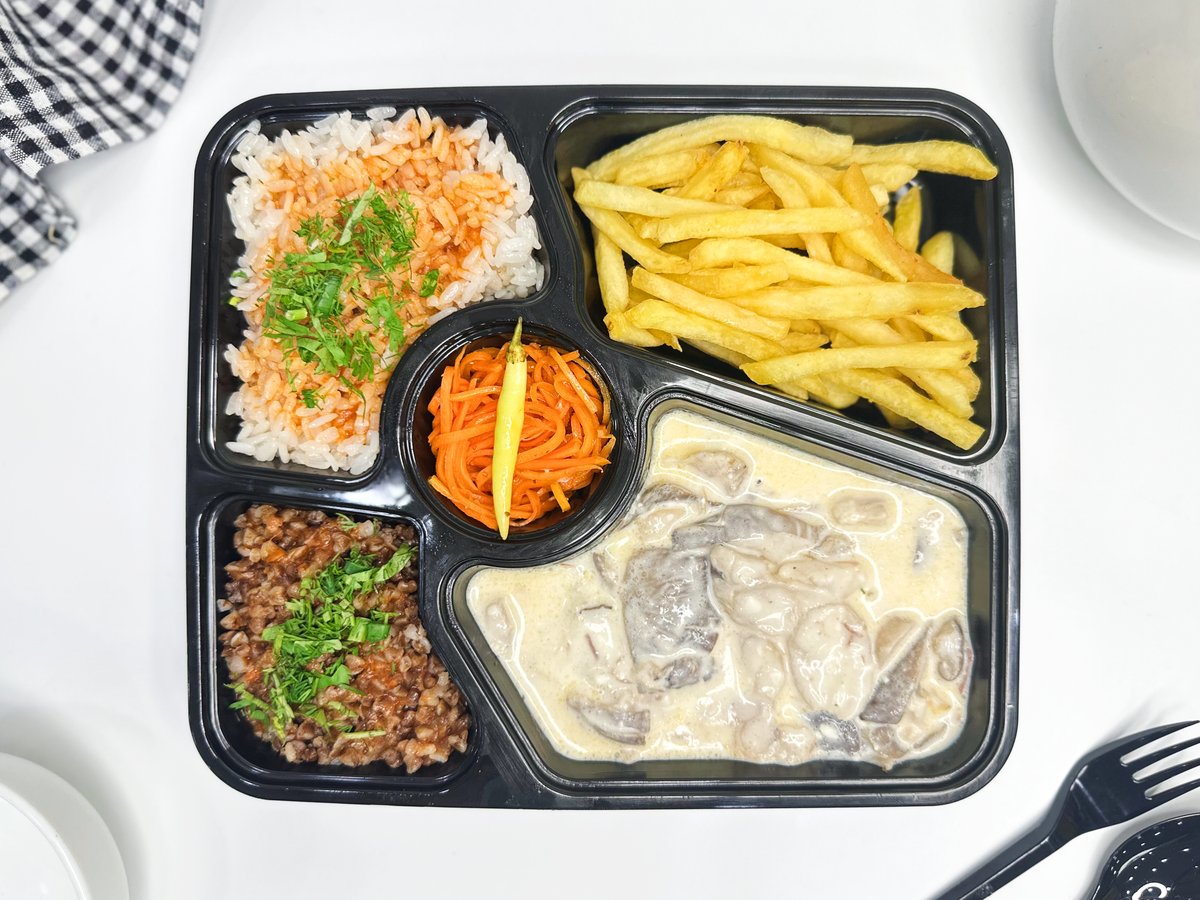 Нежная говядина, тушёная в сливках с грибами. Подаётся с гарниром. Обладает насыщенным вкусом и ароматным бульоном