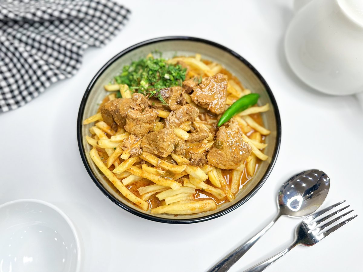 Говядина, нарезанная тонкими полосками и тушёная в соусе. Подаётся с картофелем, что создаёт гармоничное сочетание вкусов