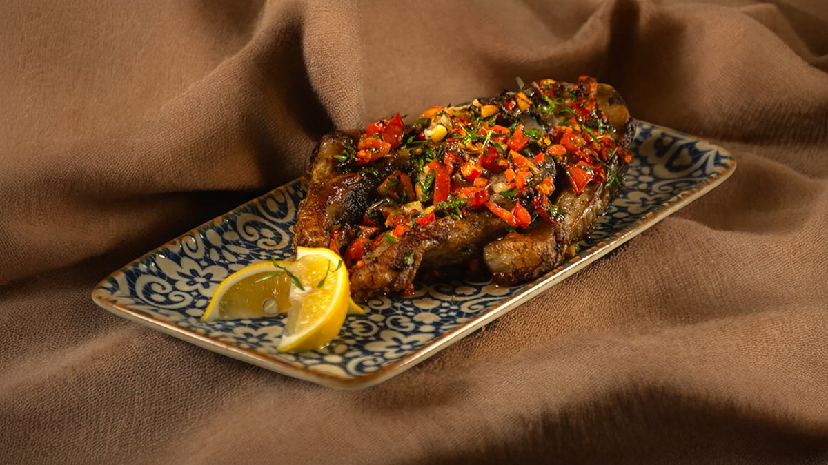 350гр. Cом, Растительное масло, лимон, помидоры, чеснок, кориандр, черный перец молотый, соль.