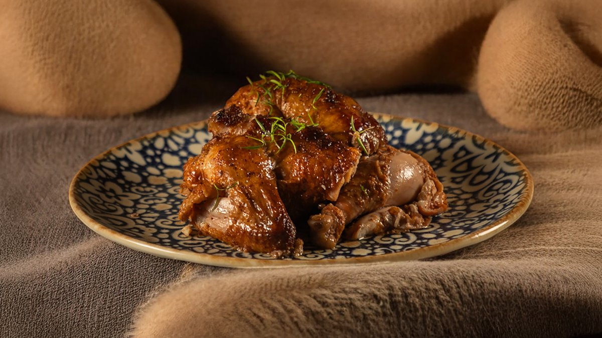 300гр. Курица, паприка, черный перец молотый, соль, джем слива, красный лук, грецский орех, зелень петрушка, гранатовый соус наршараб.