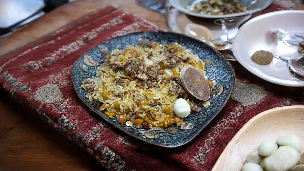 450гр. Баранина, говядина, морковь, репчетый лук, зира, черный перец, изюм, рис, горох, масло растительное, курдюк, казы, перепелиное яйцо.