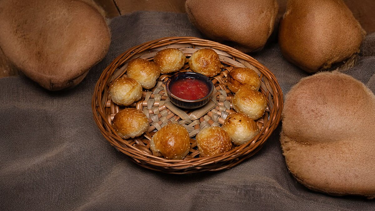 75гр. Мука, нутряной жир, репчатый лук, сливочное масло,куриная грудка, сыр моцарелла, соль, кориандр, кунжут, зира.