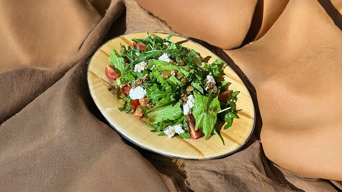 250гр. Огурцы, помидоры, болгарский перец, грецкий орех, курт, оливковое масло, латук, руккола, изюм, наршараб.