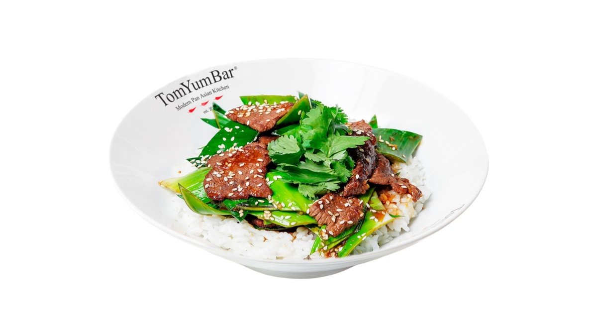 Ароматная баранина, обжаренная на WOKе с добавлением устричного соуса, имбиря, чеснока и лука порей. Подается на подушке из риса и украшается кинзой и белым кунжутом.