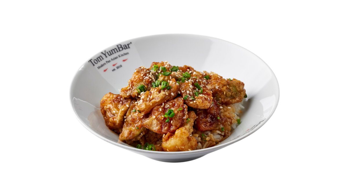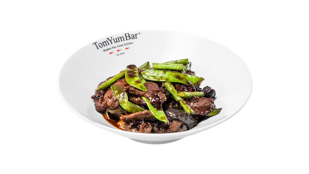 Панированная премиальная азиатская говядина, обжаренная во фритюре. Подаётся с обжаренными на WOKe овощами: стручковой фасолью, болгарским перцем, пекинской и цветной капустой, брокколи, ростками маш, красным луком с оригинальным соусом Black pepper. Украшается зелёным луком и чёрным кунжутом.