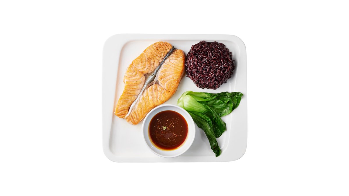 Стейк из нежного лосося под соусом "Мисо-юдзу" с диким чёрным рисом.