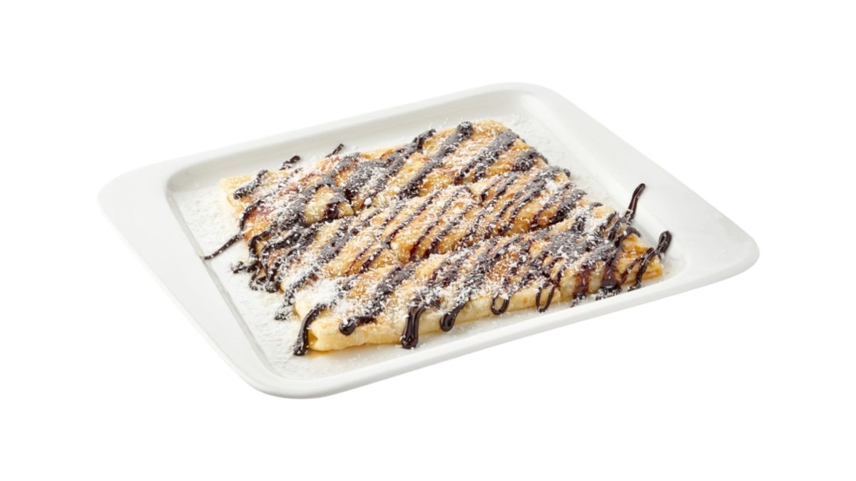Тонкий хрустящий тайский блинчик с начинкой из нутеллы и кукурузных хлопьев, с карамельным топпингом. Посыпается кокосовой стружкой и украшается листиком мяты
