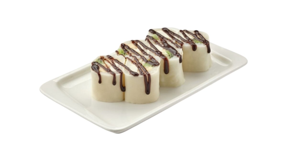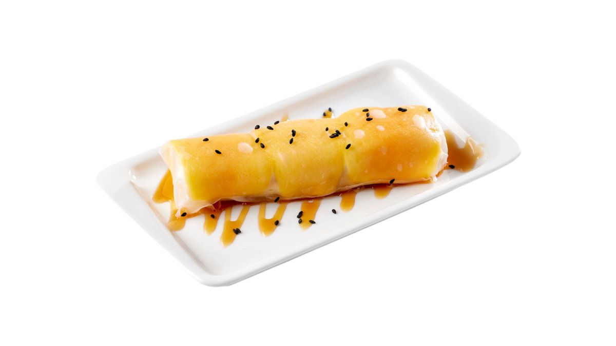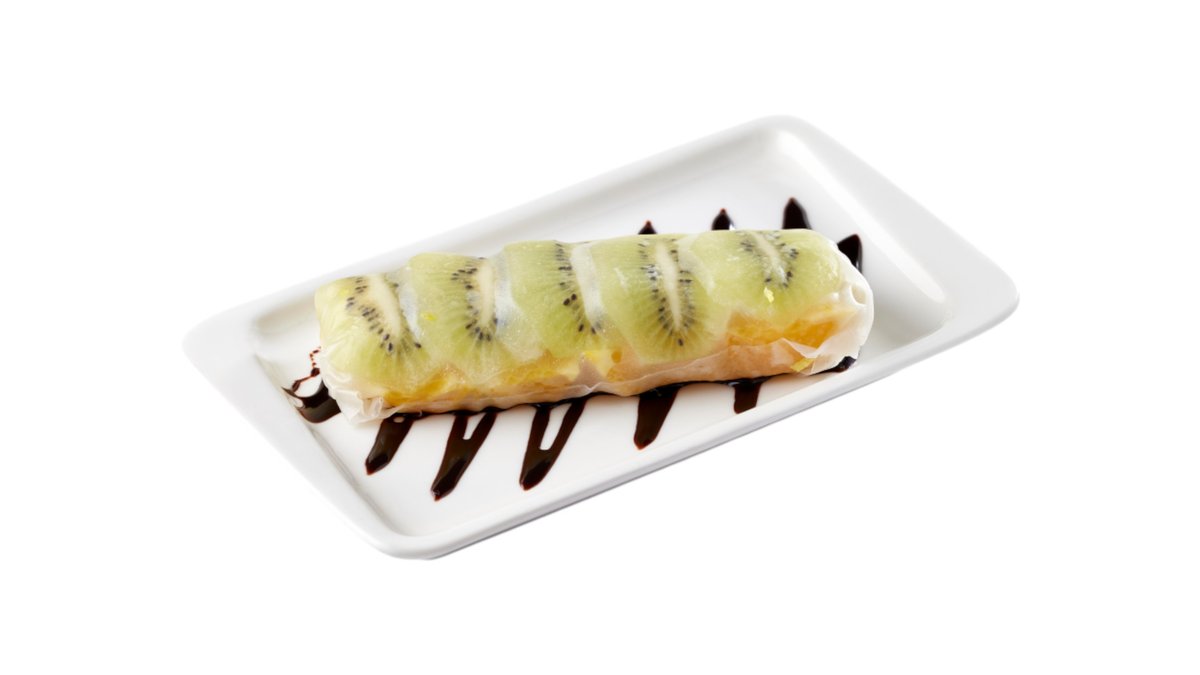 Теплый ролл без риса с начинкой из нежнейшего сыра и фрукта на выбор в тоненьком спринг-тесте