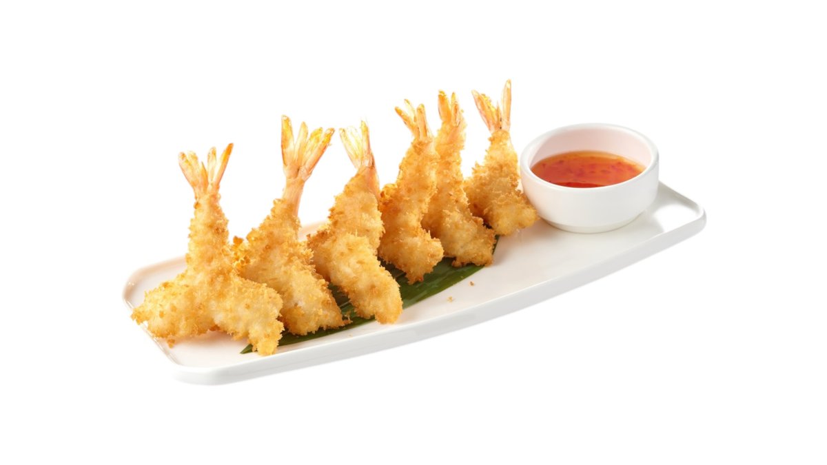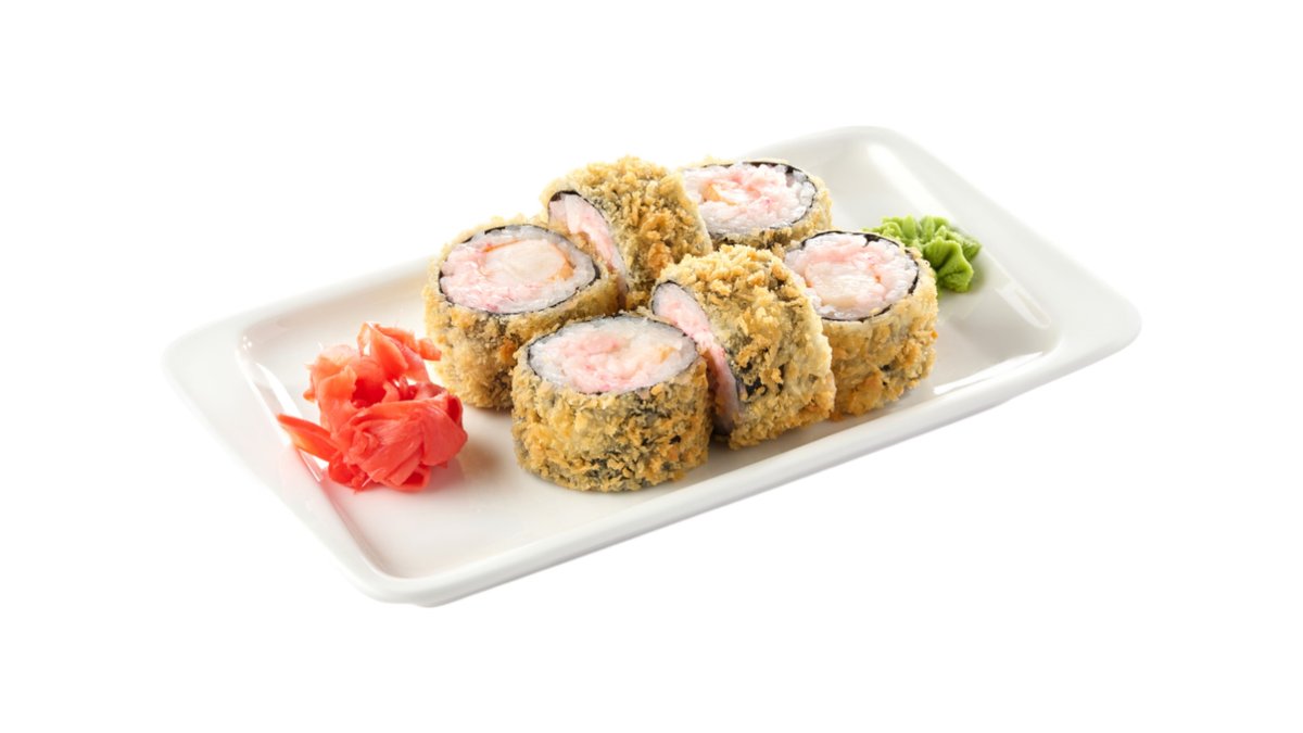 Обжаренный во фритюре и панировочных сухарях ролл, с королевской креветкой и соусом лава Подаются с имбирем и васаби.
