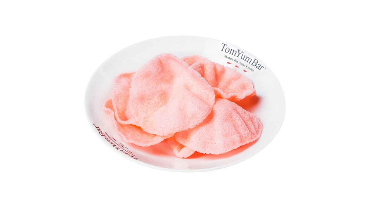 Кукурузная основа, сочные королевские креветки, зеленый лук и паприка. Блюдо подается с креветочными чипсами.