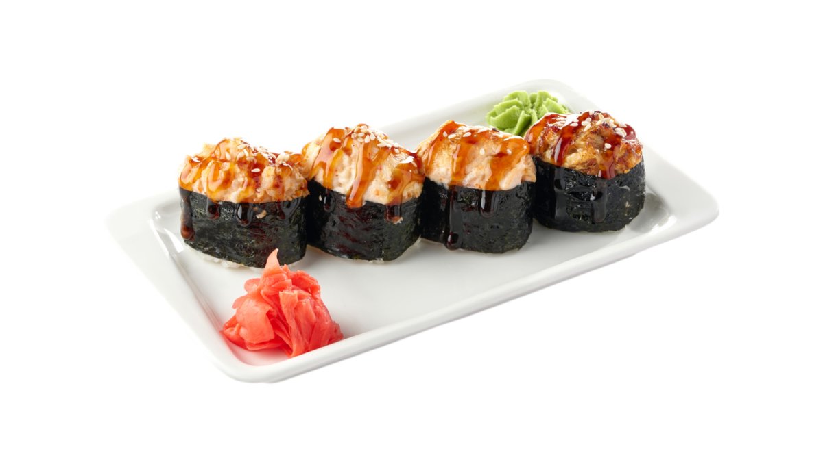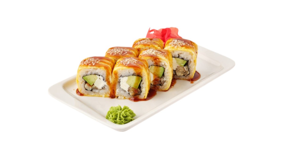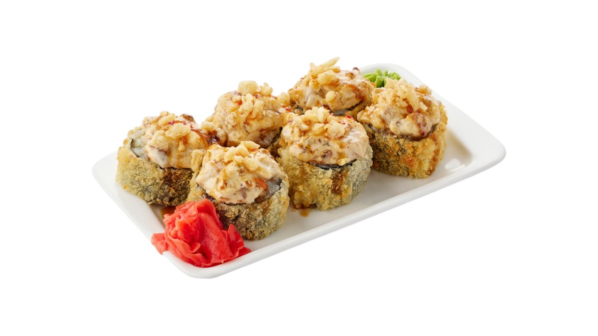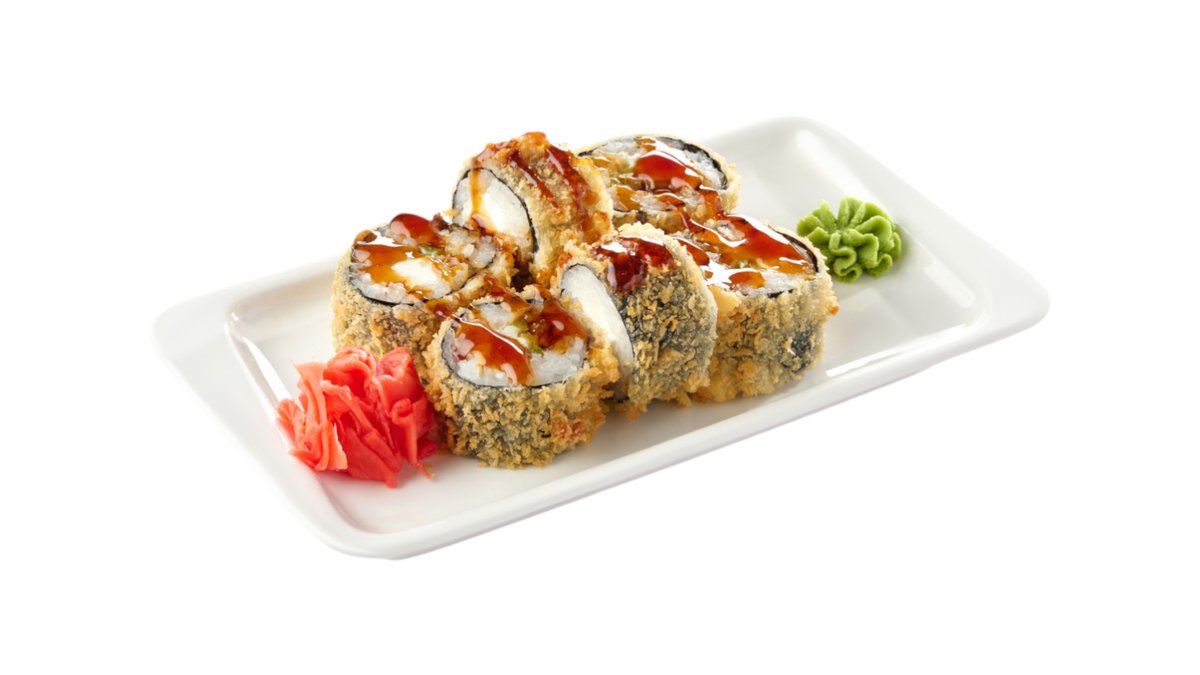 Обжаренный во фритюре и панировочных сухарях ролл, с угрем, огурцом, сливочным сыром и кунжутом, поливается соусом унаги Подаются с имбирем и васаби.