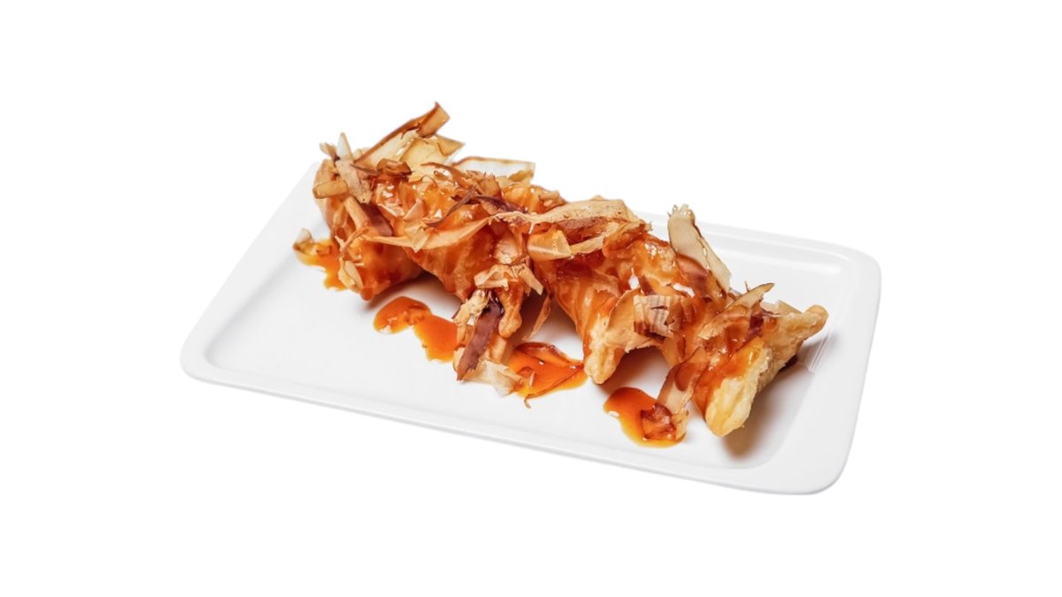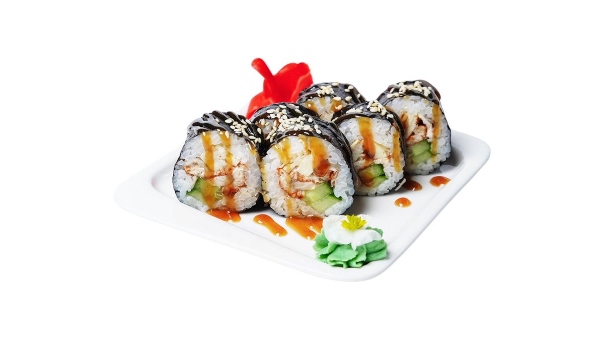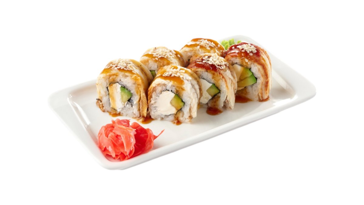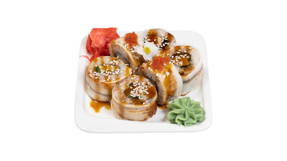 Обжаренный во фритюре и панировочных сухарях ролл, с угрем, огурцом, сливочным сыром и кунжутом, поливается соусом унаги Подаются с имбирем и васаби.