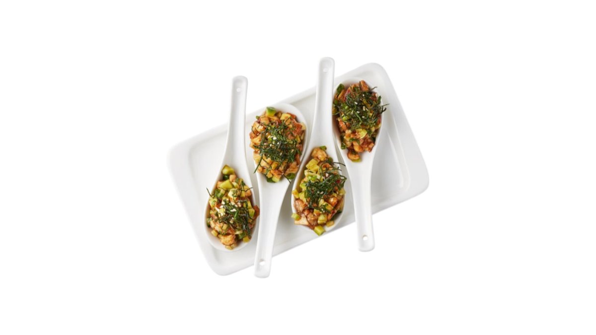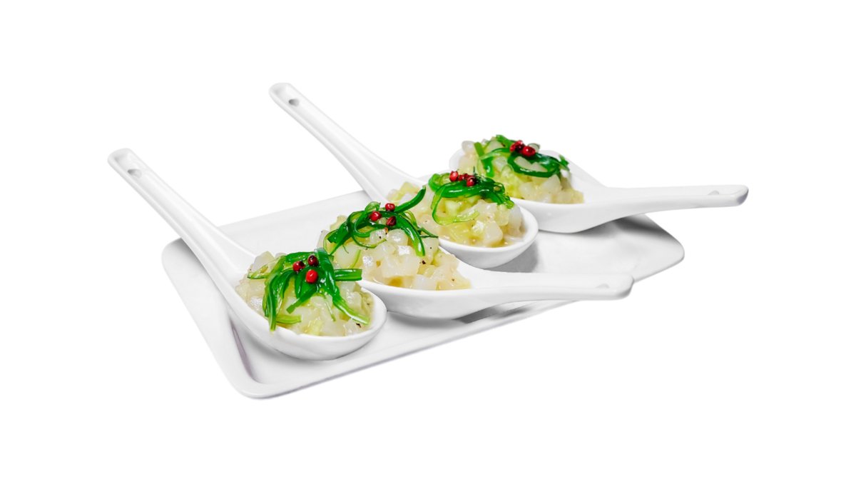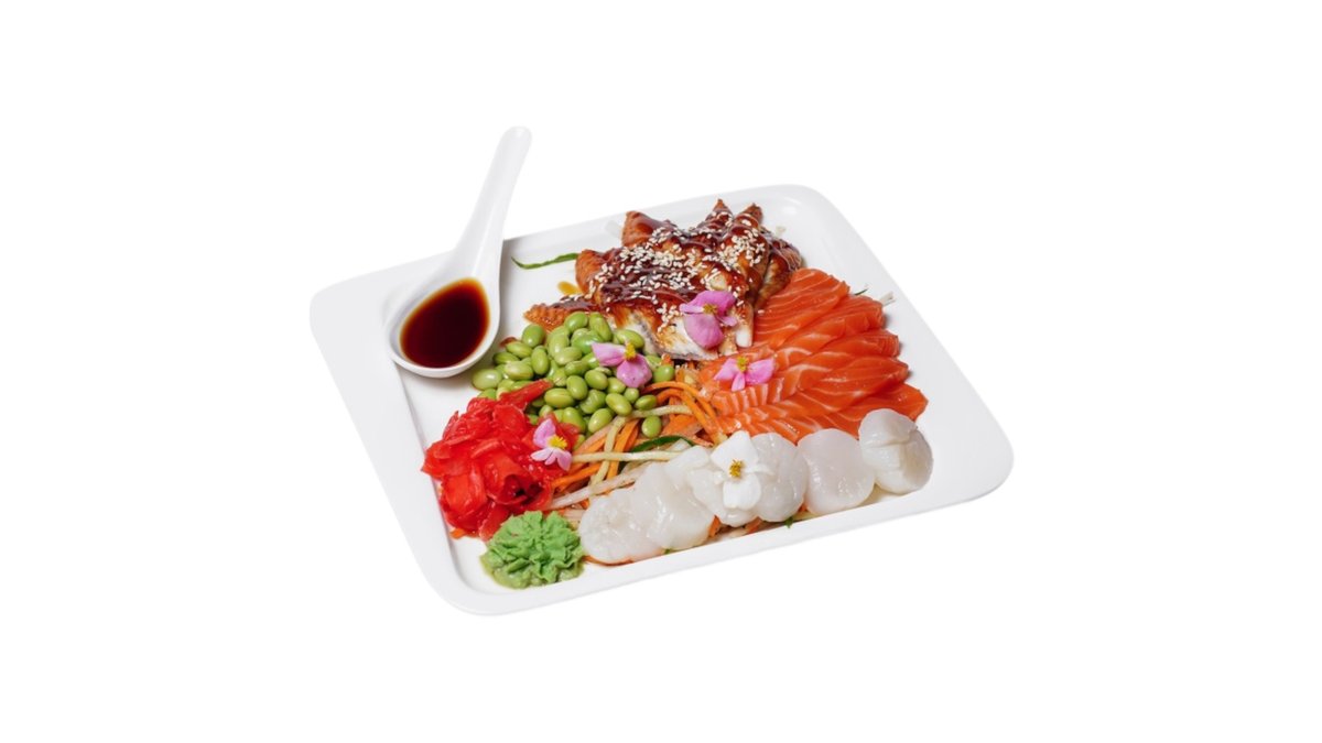 Гавайская холодная закуска из свежей семги, спелого авокадо, хрустящего такуана, сочного ананаса и водорослей кайсо. Подается на подушке из риса и заправляется пикантным кисло-сладким соусом Никкей
