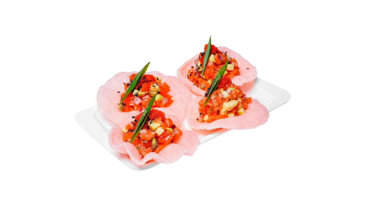 Кукурузная основа, нежнейший лосось, зеленый лук и паприка. Блюдо подается с креветочными чипсами.