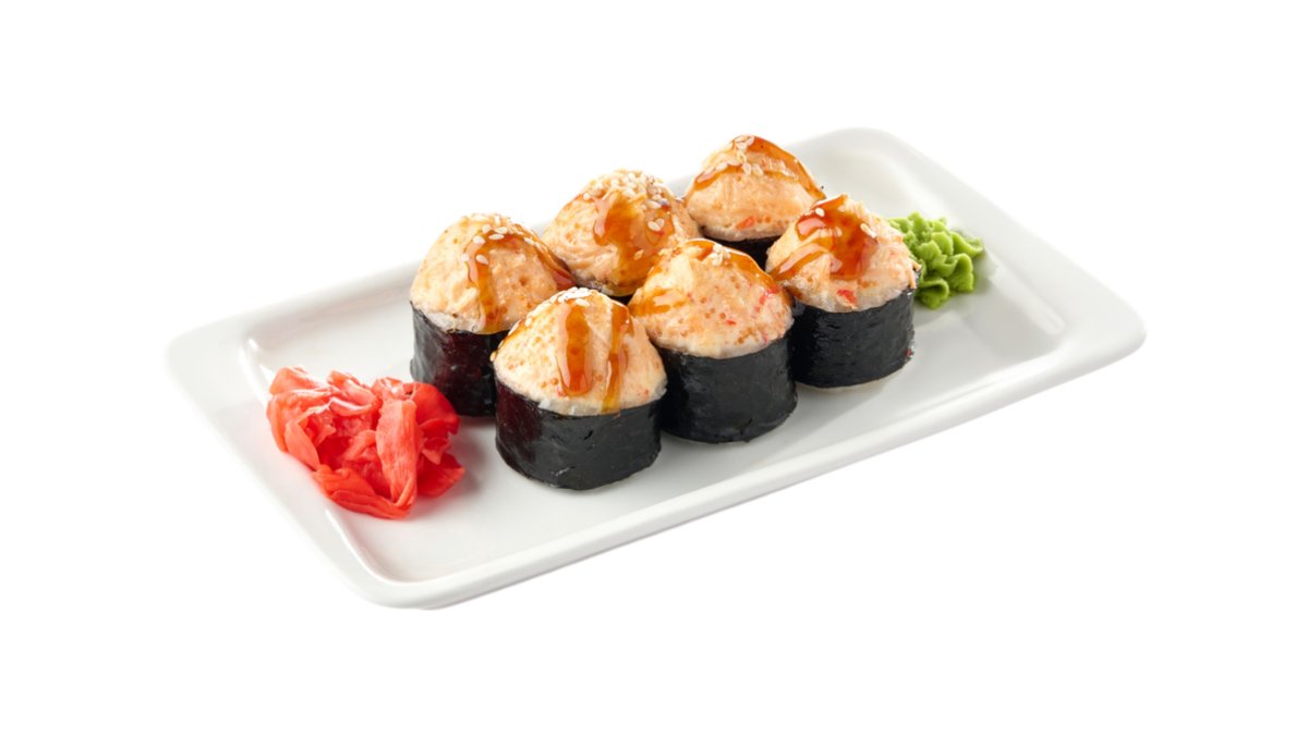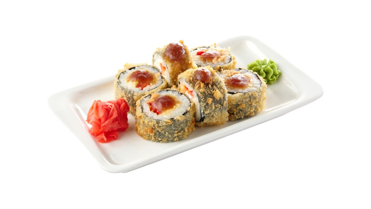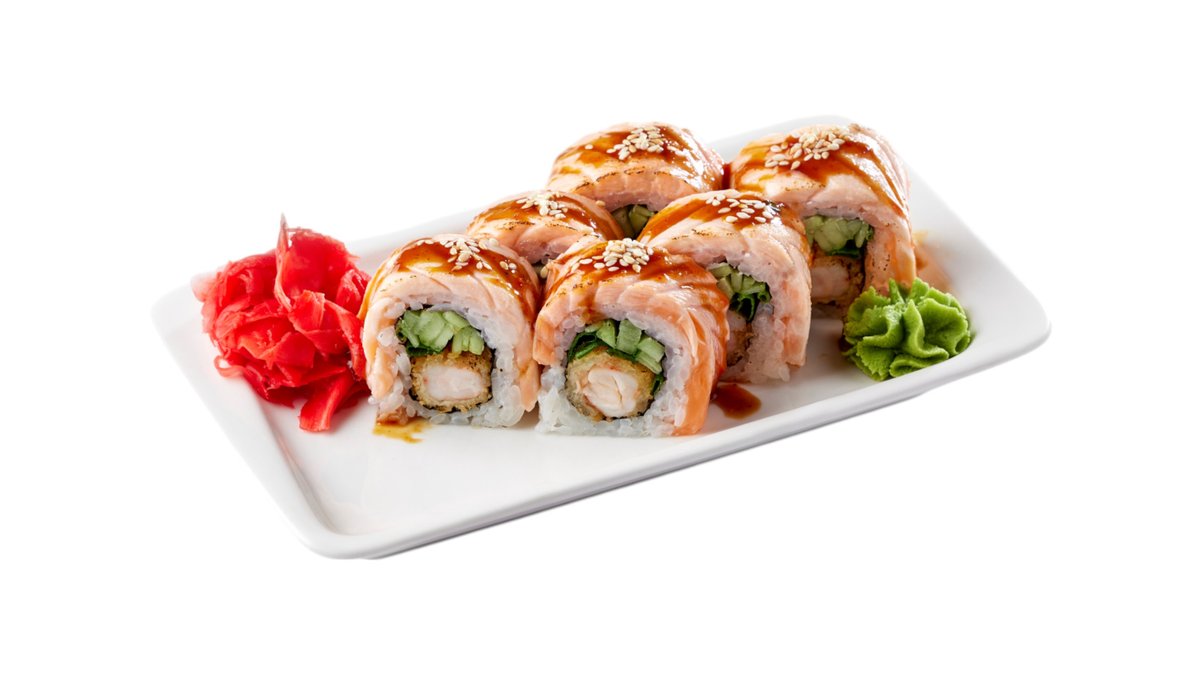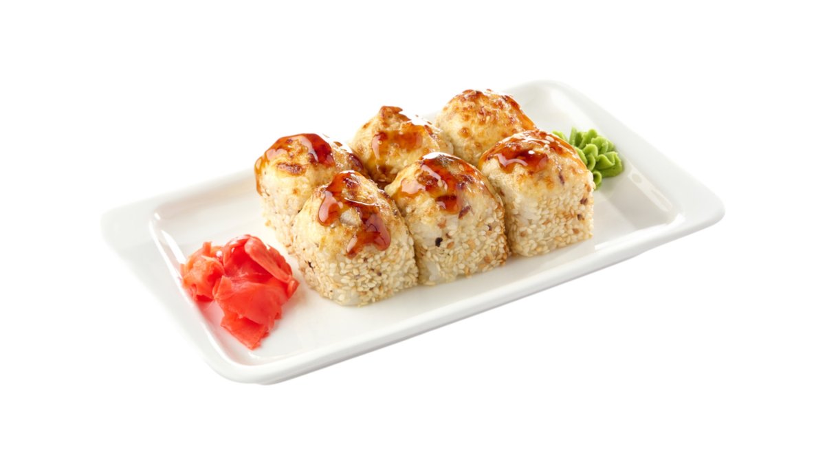 Обжаренный во фритюре и панировочных сухарях ролл, с лососем гриль, сливочным сыром и паприкой, поливается соусом терияки Подаются с имбирем и васаби.