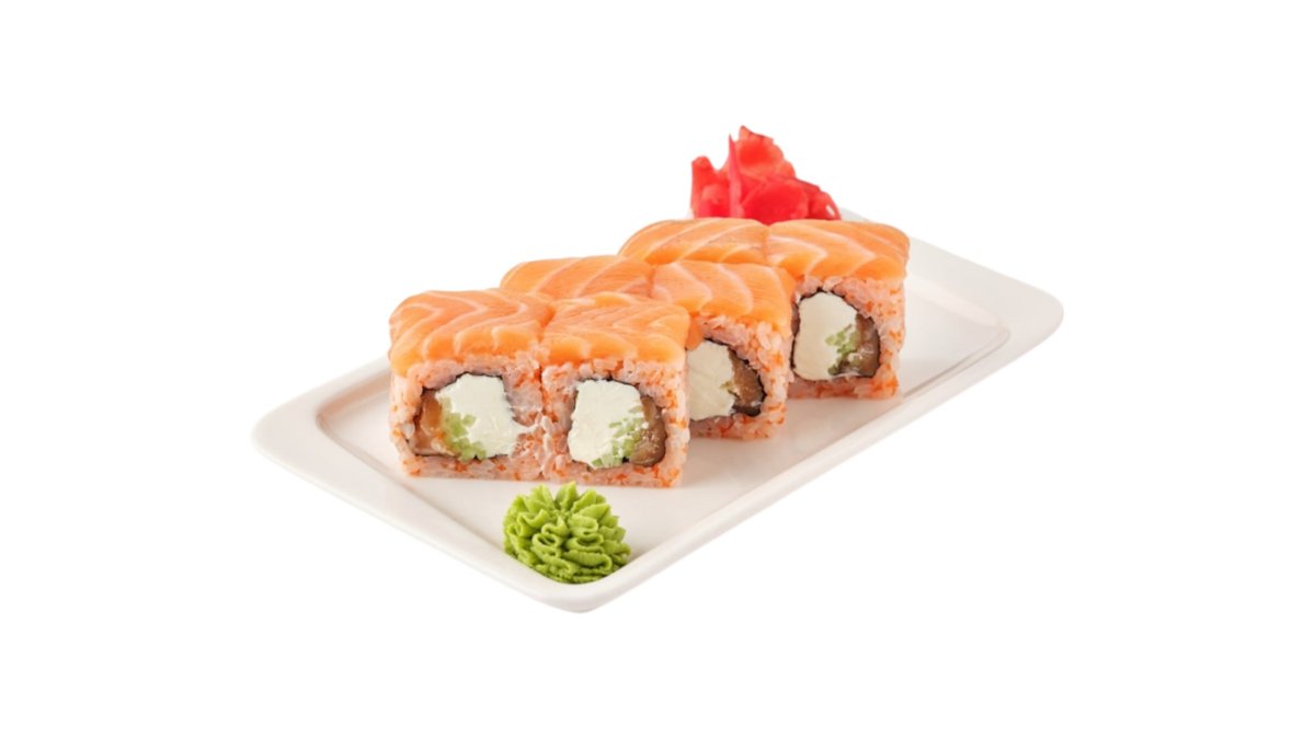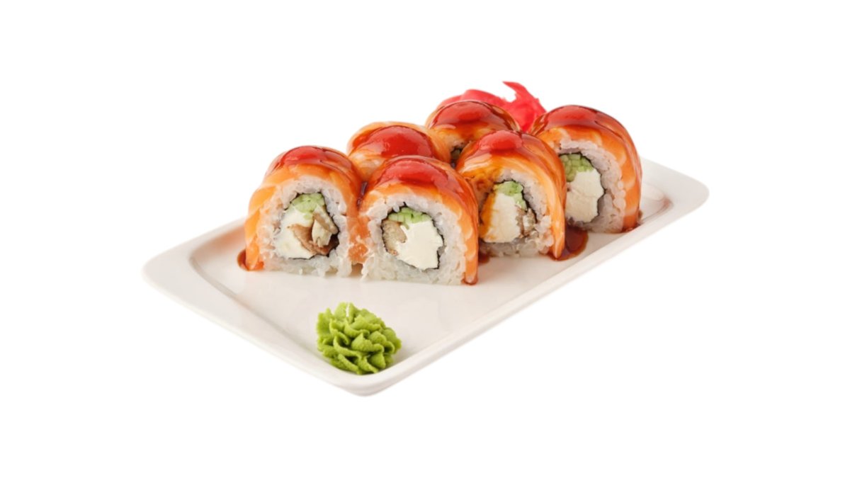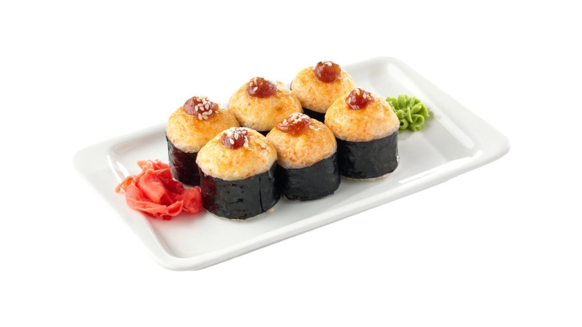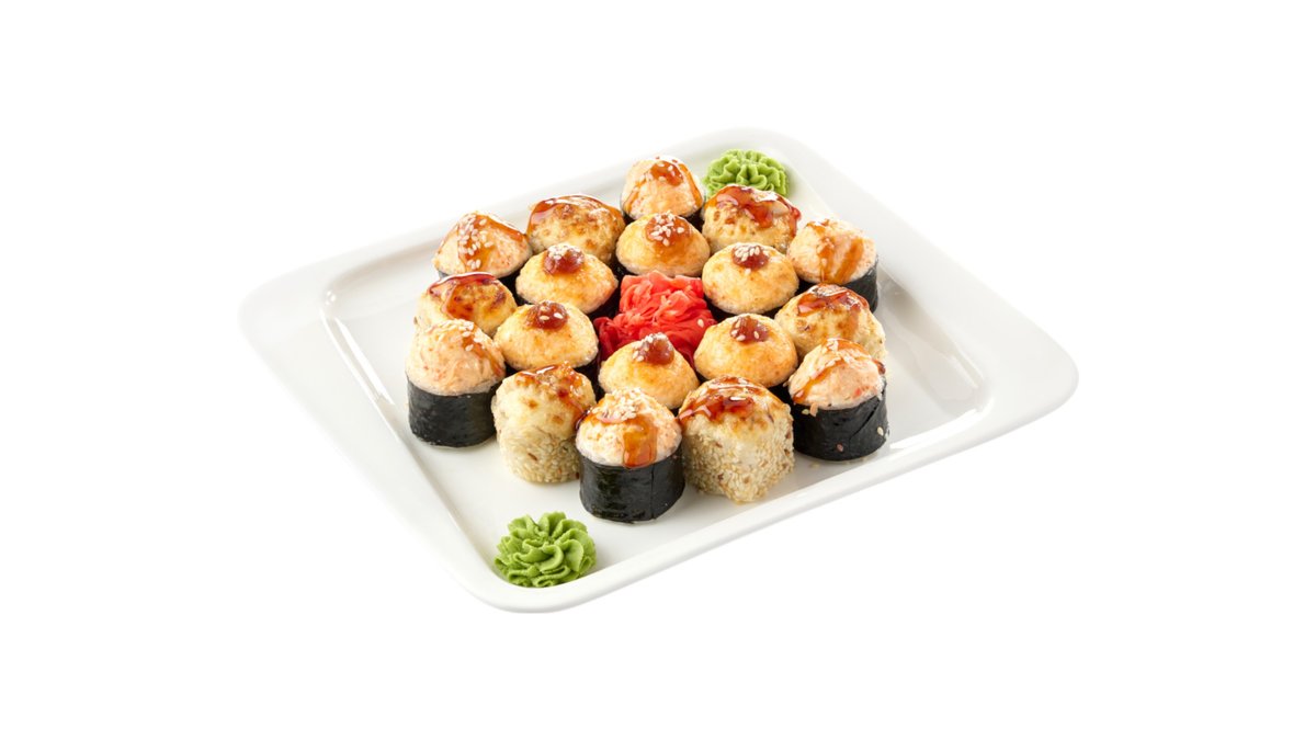 Обжаренный во фритюре и панировочных сухарях ролл, с лососем гриль, сливочным сыром и паприкой, поливается соусом терияки Подаются с имбирем и васаби.