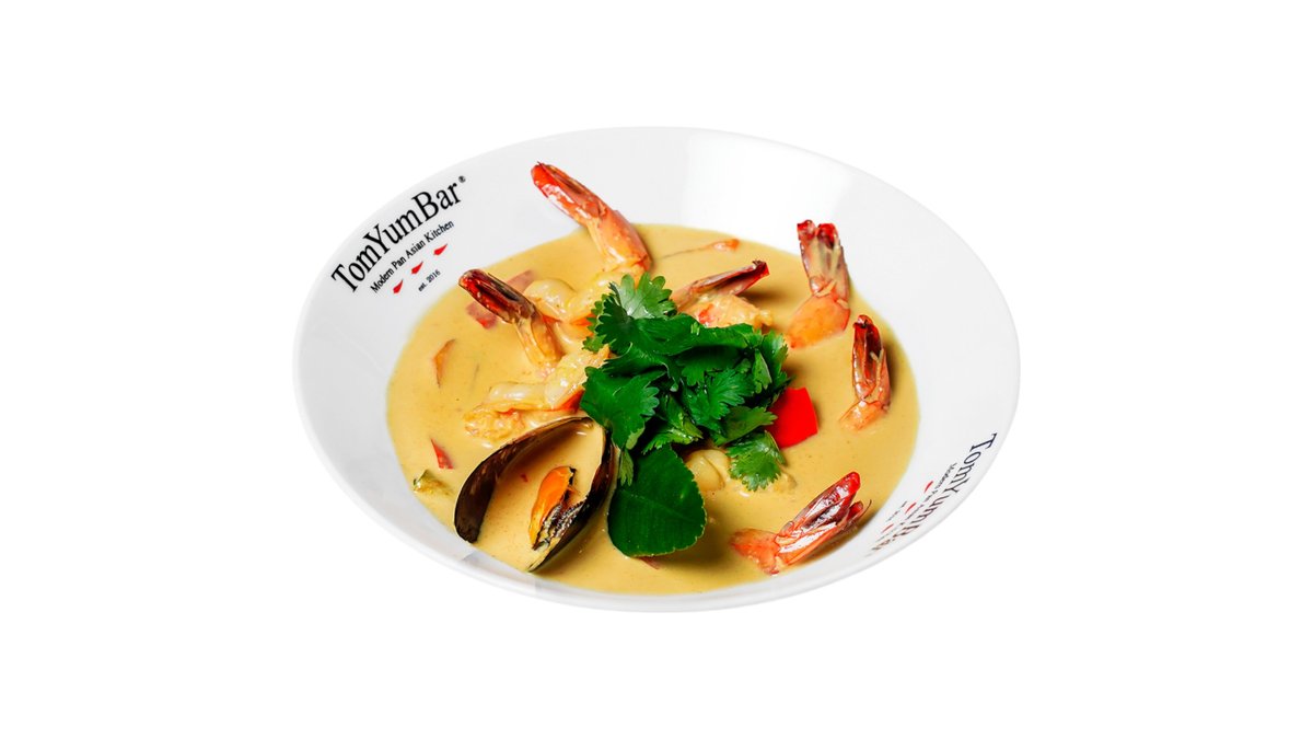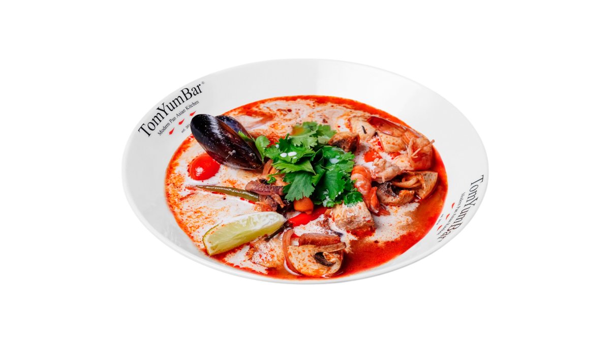 Знаменитый тайский суп на основе куриного бульона с добавлением острой пасты TomYum, оригинальных трав, специй и пряностей Таиланда. В составе: кальмар, осьминог, мясо мидий, королевская мидия в створке, королевские креветки, томаты черри, шампиньоны, лемонграсс, галангал, лист каффира, лайм, кинза, кокосовое молоко.