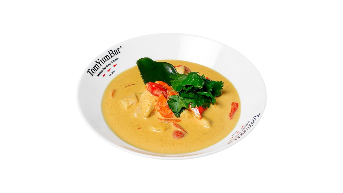 Знаменитый тайский суп на основе куриного бульона с добавлением острой пасты TomYum, оригинальных трав, специй и пряностей Таиланда. В составе: курица, томаты черри, шампиньоны, лемонграсс, галангал, лист каффира, лайм, кинза, кокосовое молоко. Подается с порцией пропаренного риса