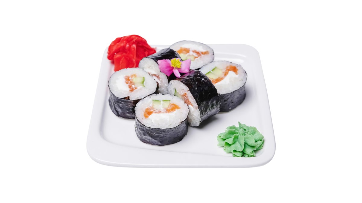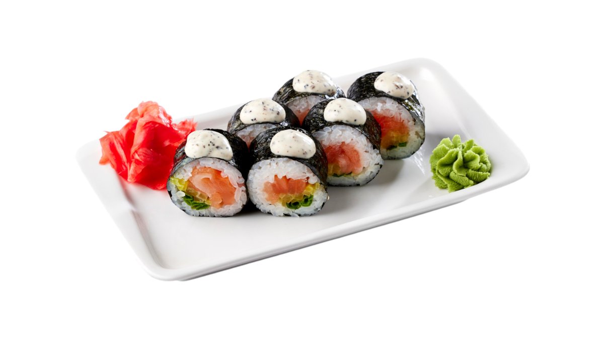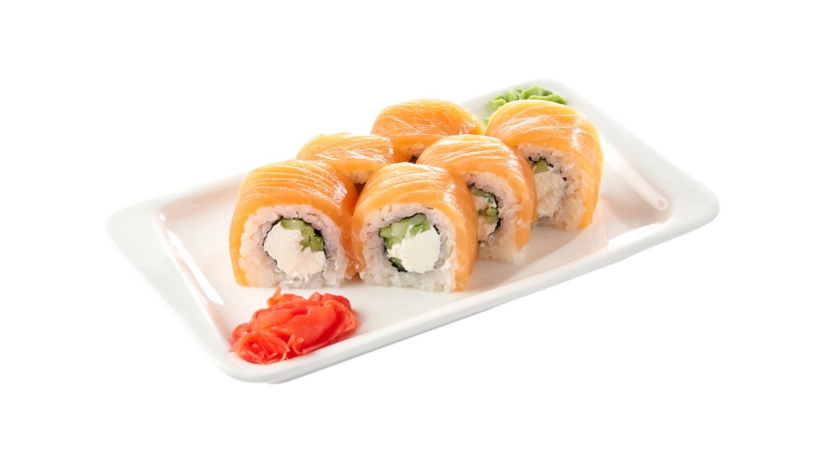 Рис, нори, сливочный сыр, свежий лосось равномерно покрывает ролл с трех сторон * указаны максимальные значения КБЖУ Подаются с имбирем и васаби.