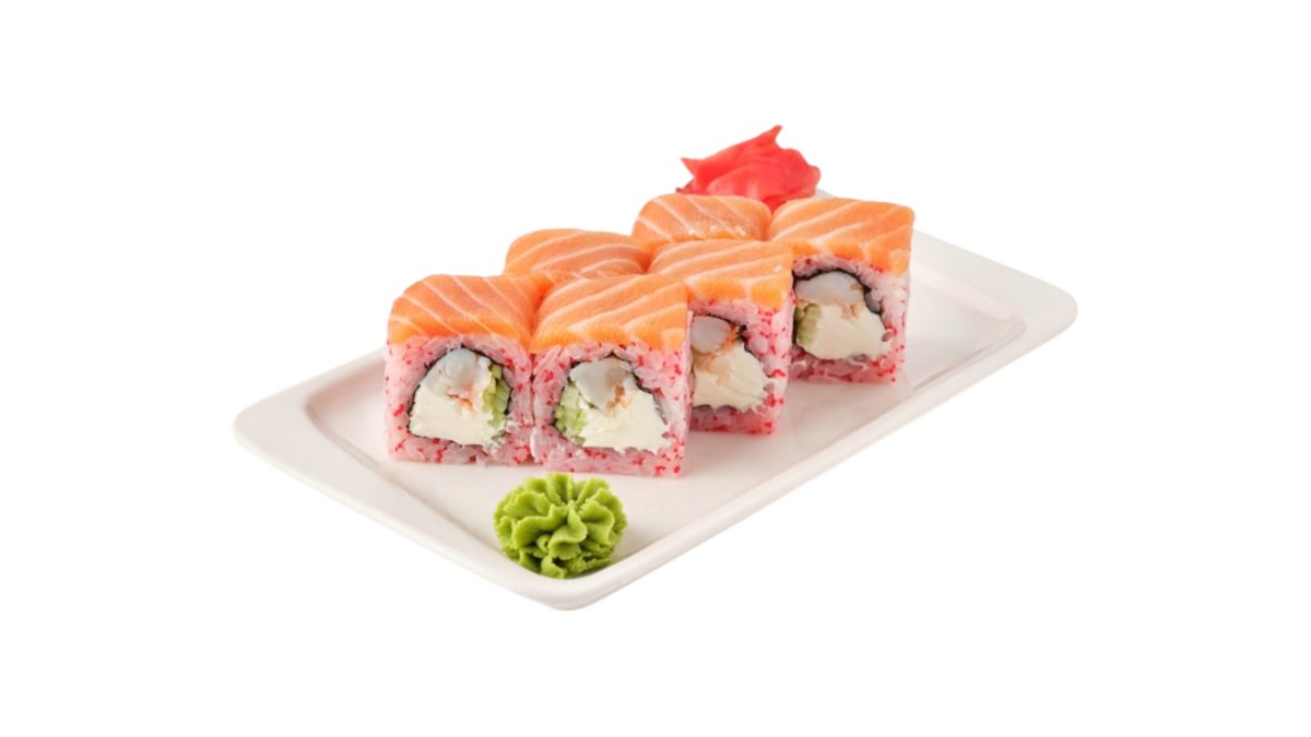 Новый вкус любимой Филадельфии от нашего Шефа! Лосось, креветка и красная икра масаго Подаются с имбирем и васаби.
