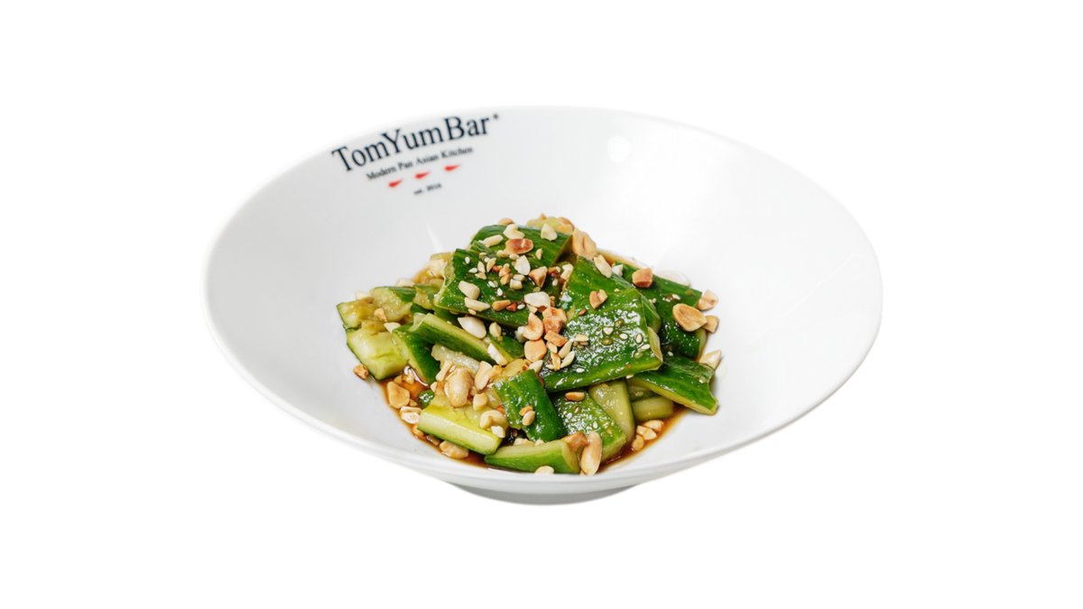 Салат из отбитых твердых частей огурца, пропитанный ароматной китайской заправкой, посыпается жареным арахисом