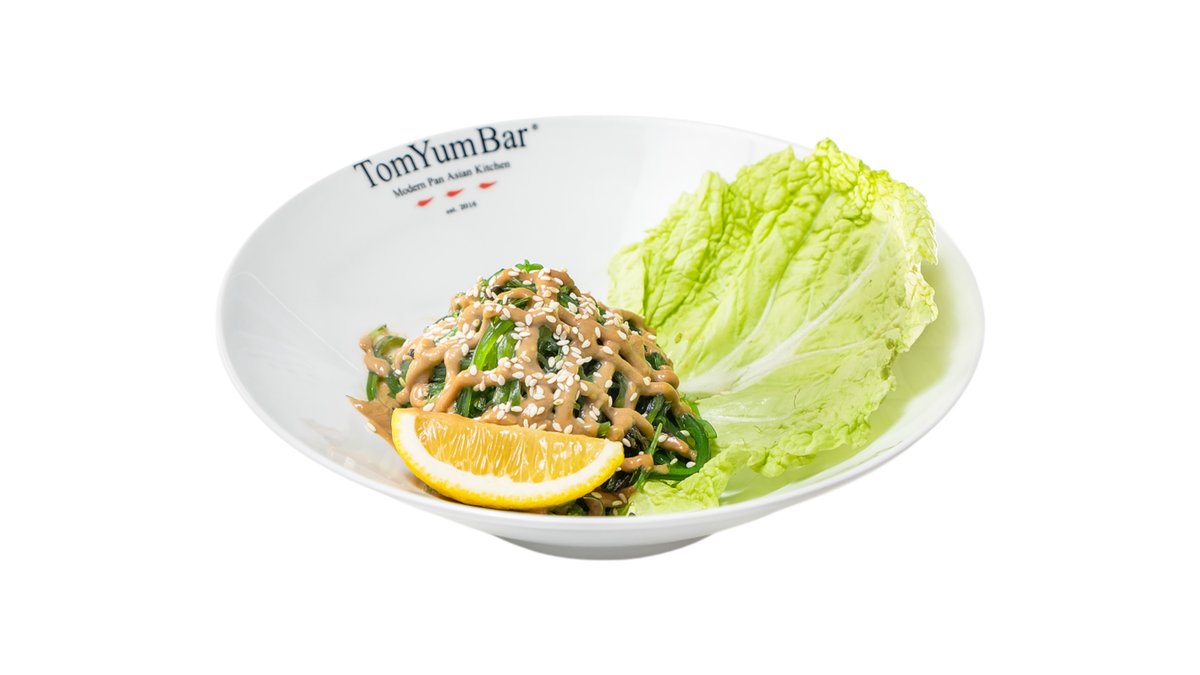 Салат из морских водорослей, подается с ореховым соусом на листе пекинской капусты с долькой лимона, посыпается кунжутом