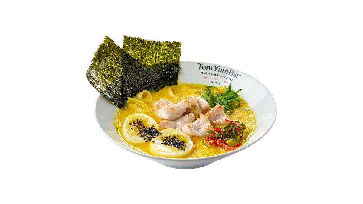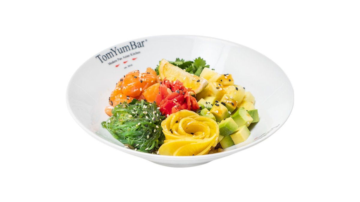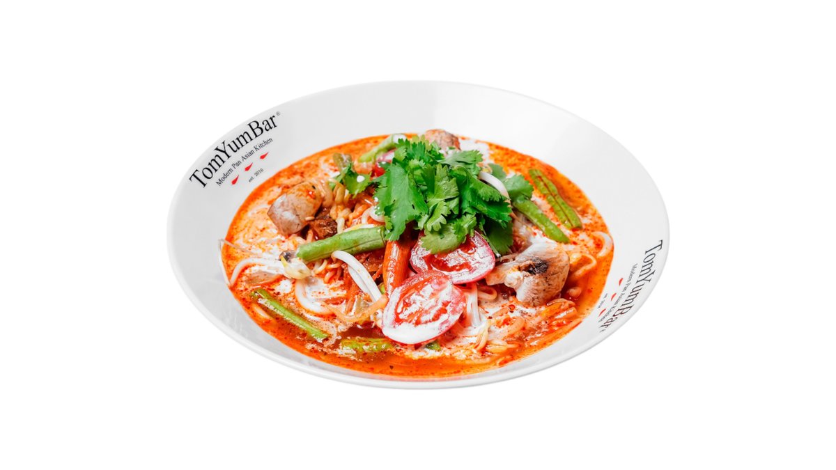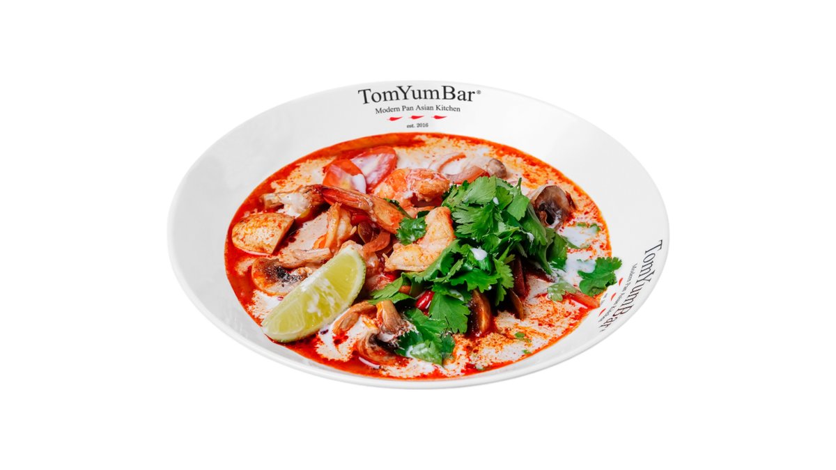 Оригинальный рецепт знаменитого тайского супа на основе куриного бульона с добавлением острой пасты TomYum, оригинальных трав, специй и пряностей Таиланда. В составе: лосось, мясо мидий, кальмары, осьминог, королевские креветки, томаты черри, шампиньоны, лемонграсс, галангал, лист каффира, лайм, кинза, кокосовое молоко. Подается с порцией пропаренного риса
