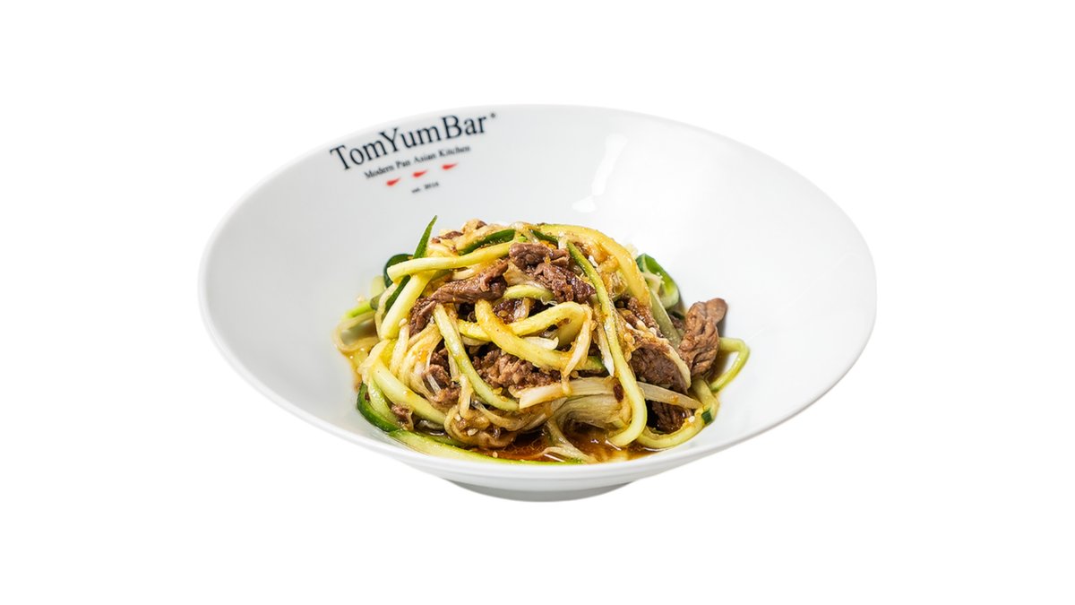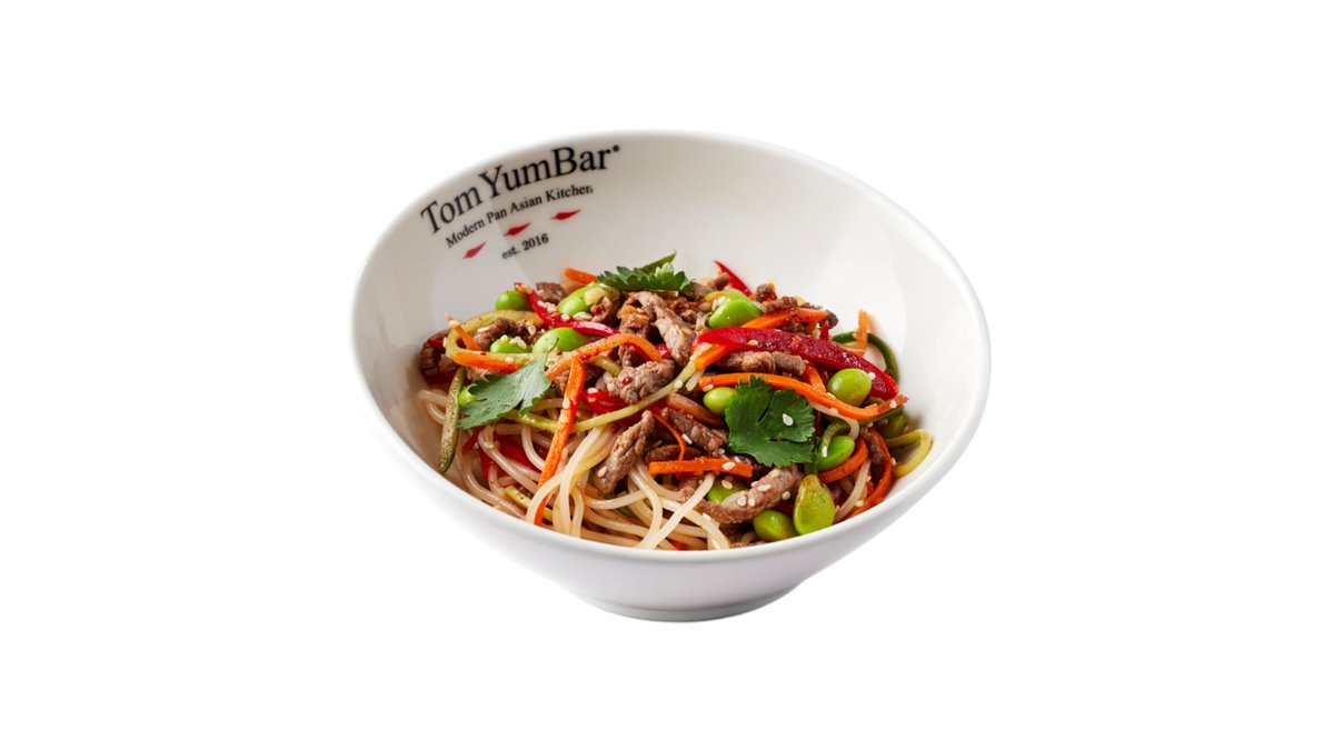 Премиальная говяжья вырезка с фунчозой, в сочетании с бобами эдамаме, соломкой из огурца, болгарского перца и моркови с оригинальной соевой заправкой. Украшается кунжутом и кинзой