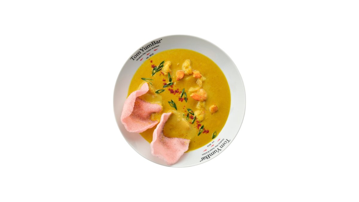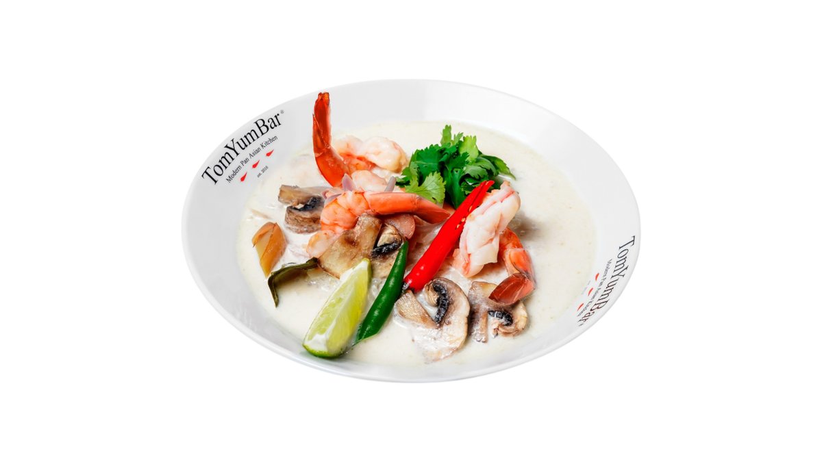 Самый нежный из знаменитых тайских супов. Готовится на курином бульоне и кокосовом молоке с добавлением сливок. Сливочный вкус с легкой остринкой, изящно сладковат и ароматен благодаря букету тайских трав и специй. В составе: королевские креветки, куриный бульон, кокосовое молоко, высококачественные сливки, шампиньоны, лук шалот, лемонграсс, галангал, лист каффира, кинза, лайм. Подается с порцией пропаренного риса