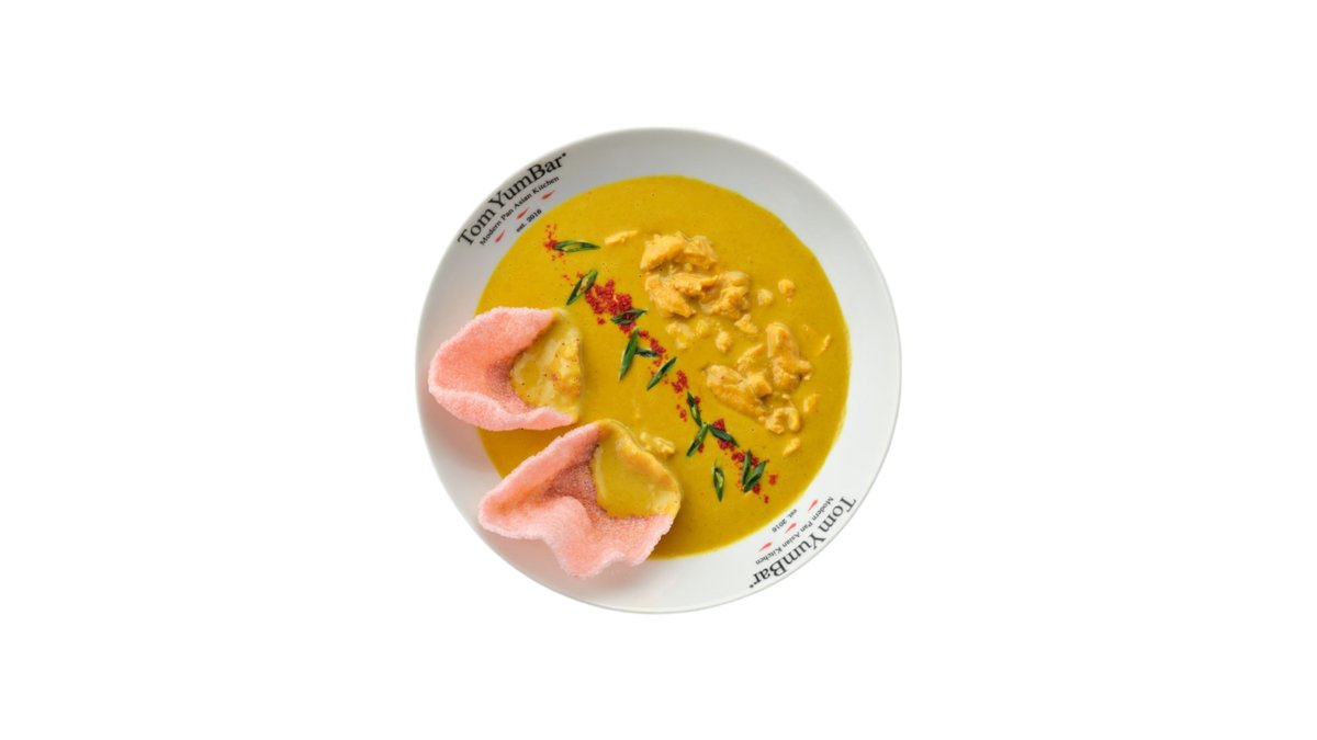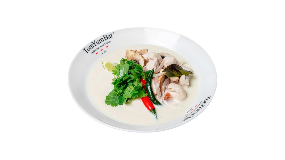Самый нежный из знаменитых тайских супов. Готовится на курином бульоне и кокосовом молоке с добавлением сливок. Сливочный вкус с легкой остринкой, изящно сладковат и ароматен благодаря букету тайских трав и специй. В составе: курица, куриный бульон, кокосовое молоко, высококачественные сливки, шампиньоны, лук шалот, лемонграсс, галангал, лист каффира, кинза, лайм. Подается с порцией пропаренного риса