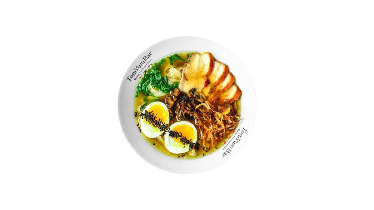Традиционный японский суп на курином бульоне с лапшой Рамэн. В составе: куриный бульон, лапша рамэн, ломтики запеченной курицы, шампиньоны, яйцо, зеленый лук, лук порей, черный кунжут