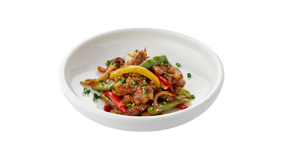 Яркое сочетание нежной говядины и микса болгарских перцев с сельдереем и тайским горошком в устричном соусе. Украшается кунжутом и зелёным луком.