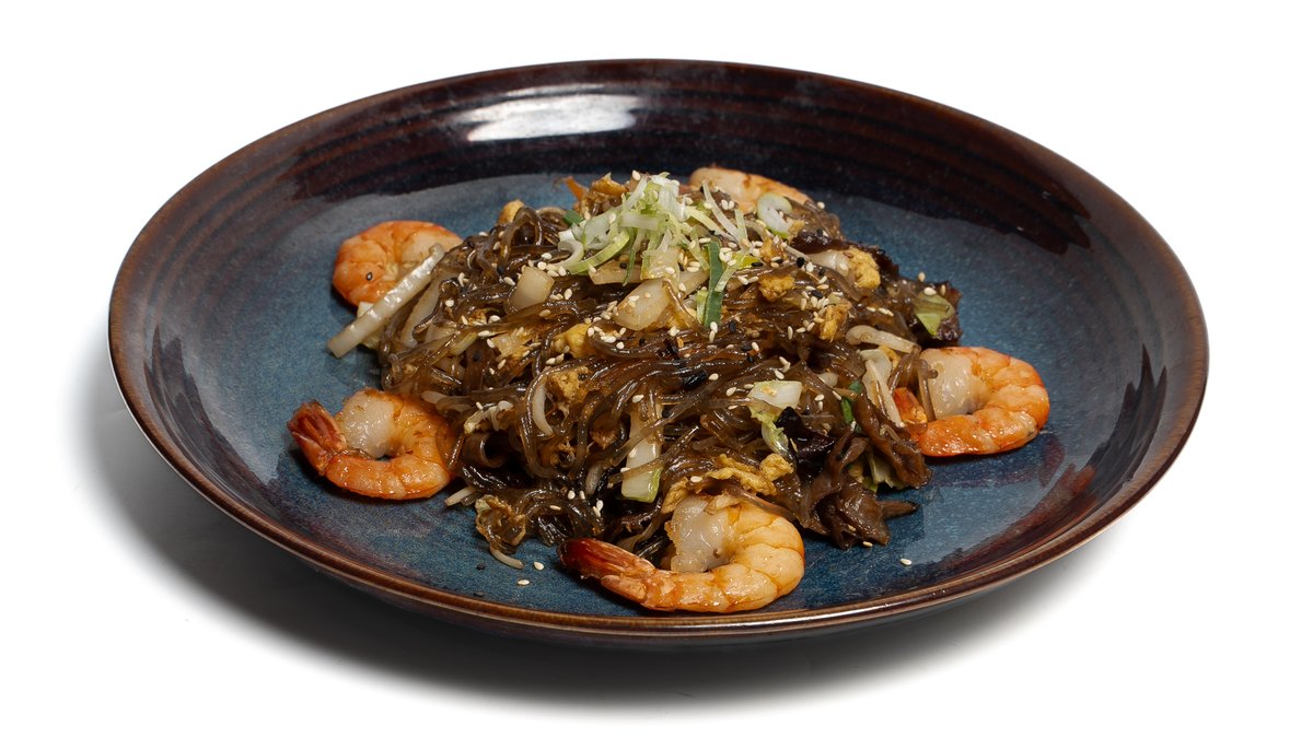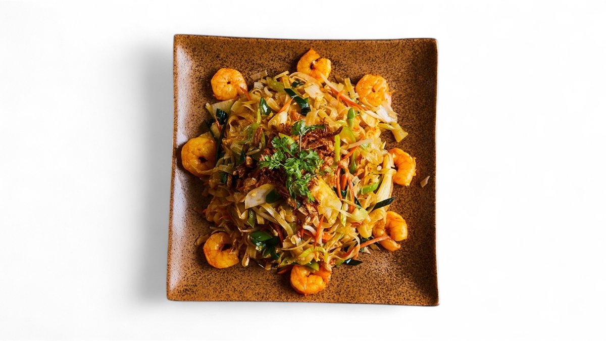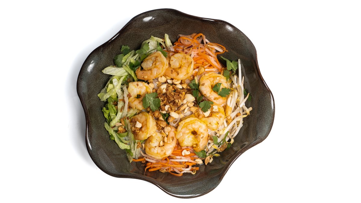 Restované rýžové nudle s tigří krevety,tamarindovou omáčkou, zelenina, koriandr,křupavá cibulka.